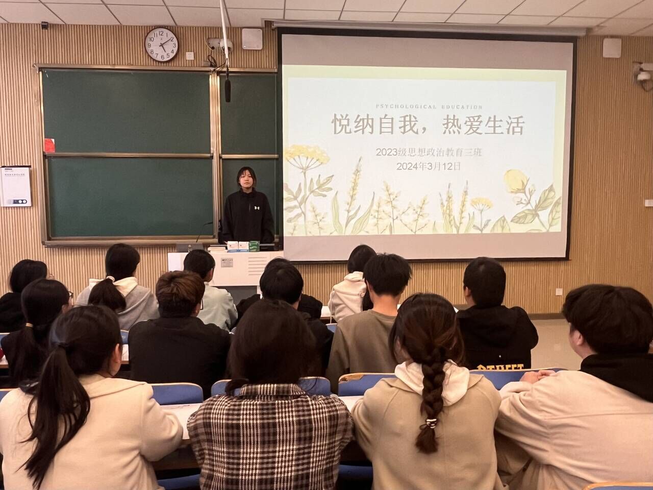 为普及心理健康教育,3月12日上午,金年会jinnianhuicom2023级思想政治教育三班在社科楼515教室召开“悦纳自我,热爱生活”心理健康班会。金年会官网2023级思想政治教育三班全体成员共同参加此次班会,班会由心理委员安雅楠主持。