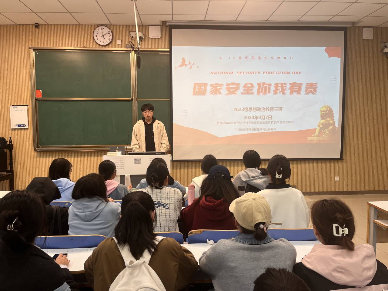 为深入贯彻总体国家安全观,进一步增强学生国家安全和法治意识,培养学生的爱国情怀,4月7日下午,金年会jinnianhuicom2023级思想政治教育三班在社科楼515教室举行“国家安全你我有责”主题班会。金年会官网2023级思想政治教育三班全体成员共同参加此次班会,班会由团支书郝瀚主持。