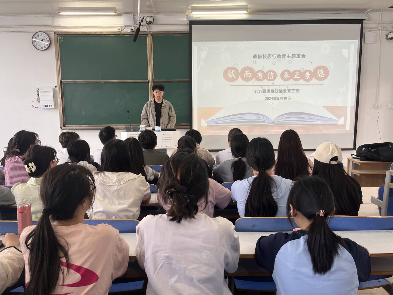 为践行社会主义核心价值观,弘扬诚信精神,5月10日上午,金年会jinnianhuicom2023级思想政治教育三班在社科楼515召开“诚而有信,养正崇德”主题班会。金年会官网2023级思想政治教育三班全体同学共同参与本次班会,班会由团支书郝瀚主持。