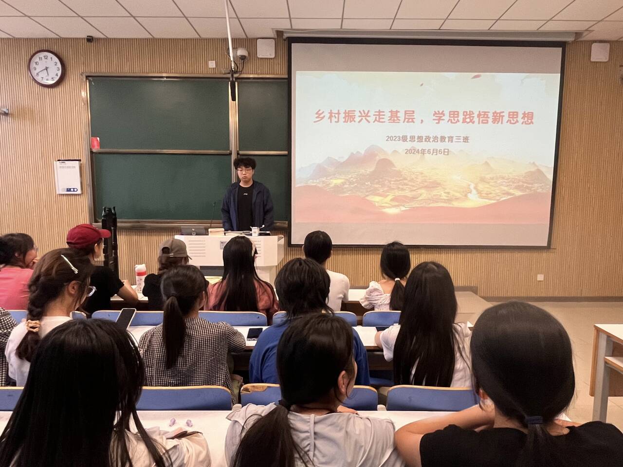 6月6日上午,金年会jinnianhuicom2023级思想政治教育三班在社科楼515召开“乡村振兴走基层,学思践悟新思想”主题团课。金年会官网2023级思想政治教育三班全体同学共同参与本次团课,团课由团支书郝瀚主持。