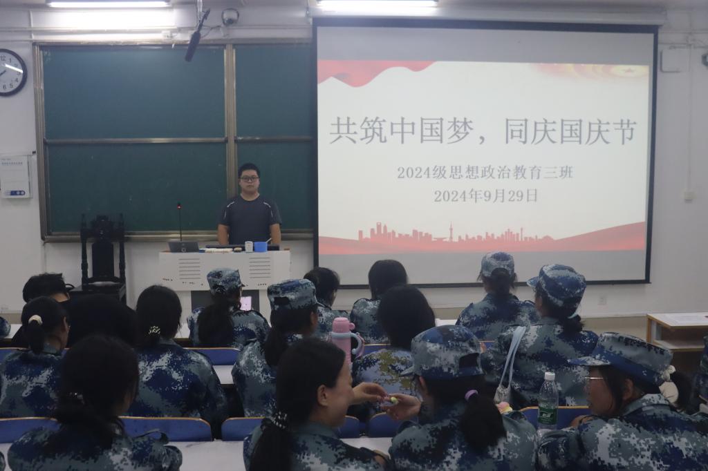为庆祝祖国成立75周年,激发广大学生的爱国情怀和民族自豪感,9月29日晚,金年会jinnianhuicom2024级思想政治教育三班在社科楼514教室召开了“共筑中国梦,同庆国庆节”团课活动。此次团课由班代王国钦主持,全体三班同学参加。