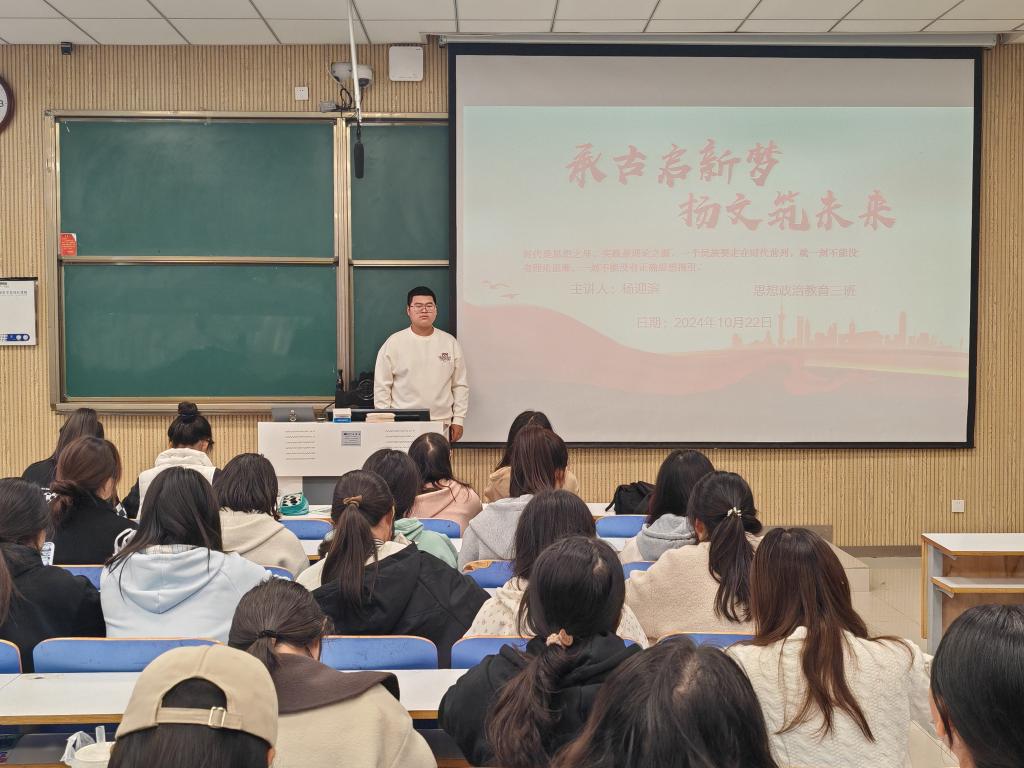 为了深入学习习近平文化思想,加强政治认同,增强文化自信,金年会jinnianhuicom2024级思想政治教育三班于10月22日上午举办“承古启新梦,扬文助未来”主题团课活动。本次团课活动由团支书杨迎滨主持。