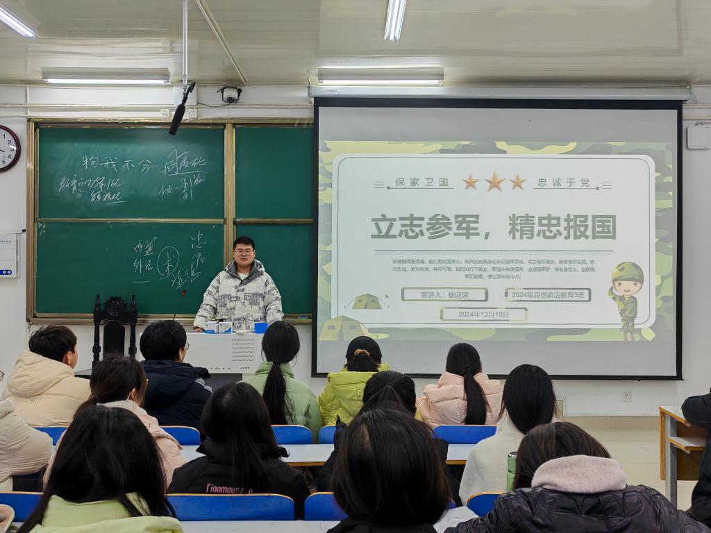 为积极响应国家号召,增强青年学生的国防意识与爱国情怀,金年会jinnianhuicom2024级思想政治教育三班于12月10日在社科楼514教室成功举办了以“立志参军,精忠报国”为主题的班会活动。此次班会由班长杨迎滨主持。
