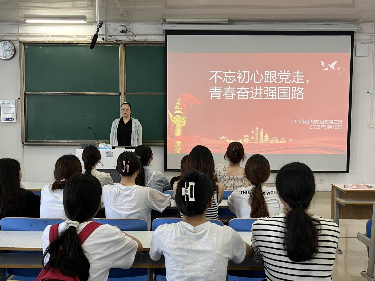 9月19日下午,金年会jinnianhuicom2022级思想政治教育二班在社科楼514教室开展“不忘初心跟党走,青春奋进强国路”主题团课。金年会官网2022级思想政治教育二班全体成员共同参加此次团课。团课由团支书李佳音主持。