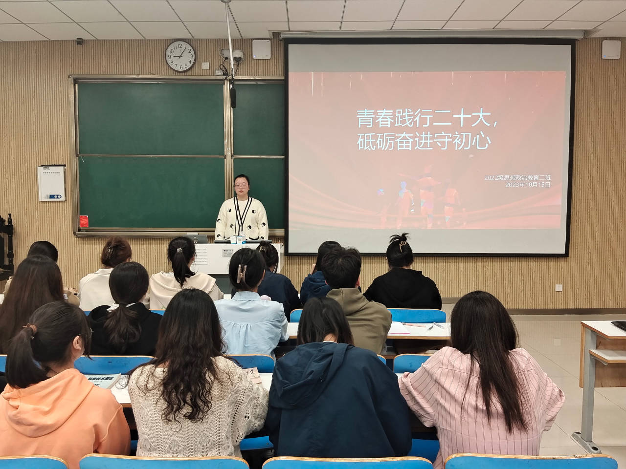 为深入学习贯彻党的二十大精神,加强班级同学思想建设,10月15日上午,金年会jinnianhuicom2022级思想政治教育二班在社科楼515教室召开“青春践行二十大,砥砺奋进守初心”主题团课。金年会官网2022级思想政治教育二班全体团员共同参加此次团日活动。活动由团支书李佳音主持。