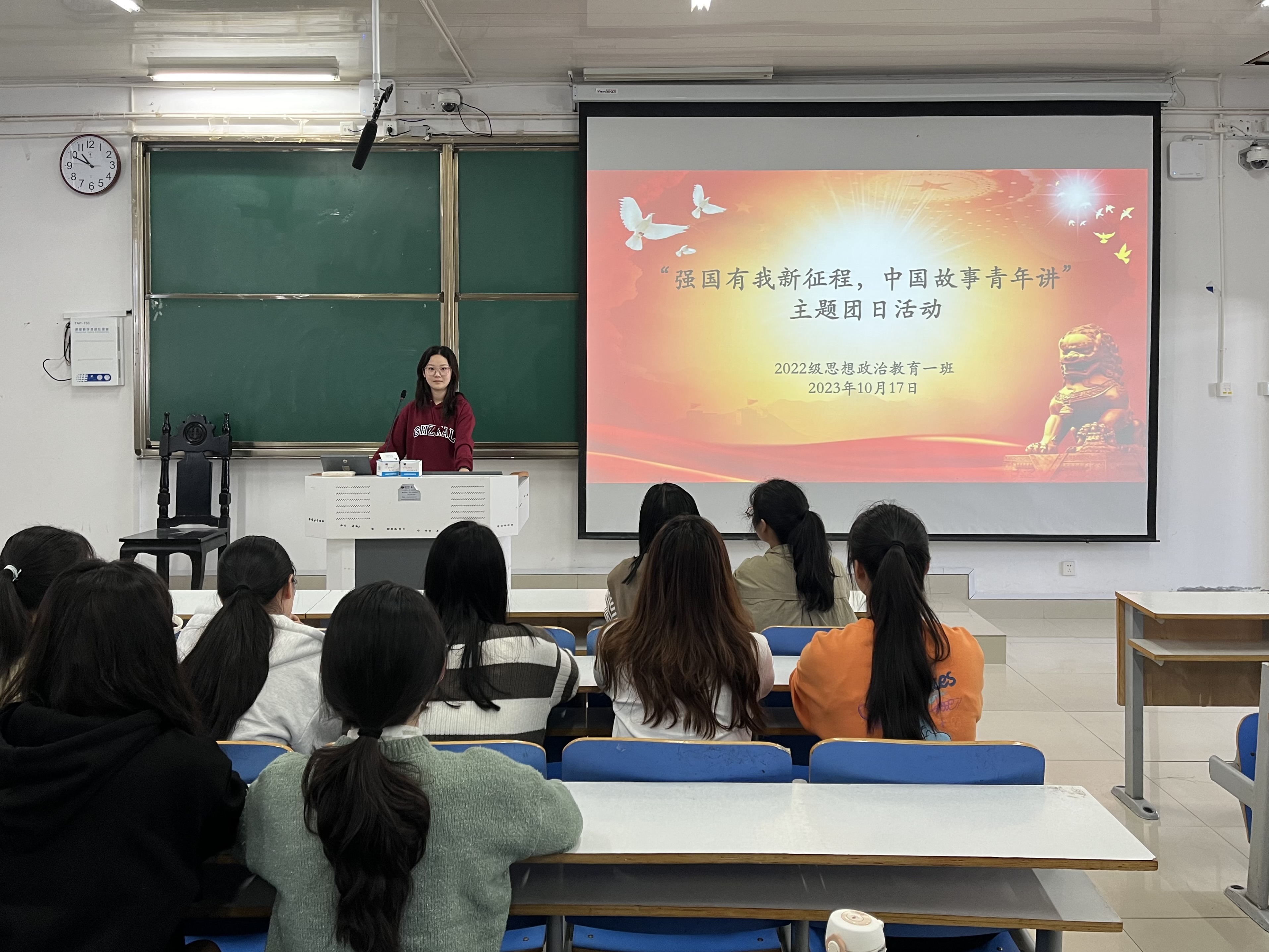 为深入学习中国青年爱国精神,10月17日上午,金年会jinnianhuicom2022级思想政治教育一班在社科楼514教室召开“强国有我新征程,中国故事青年讲”主题团课。金年会官网2022级思想政治教育一班全体同学共同参与本次团课,团课由团支书李佳茹主持。