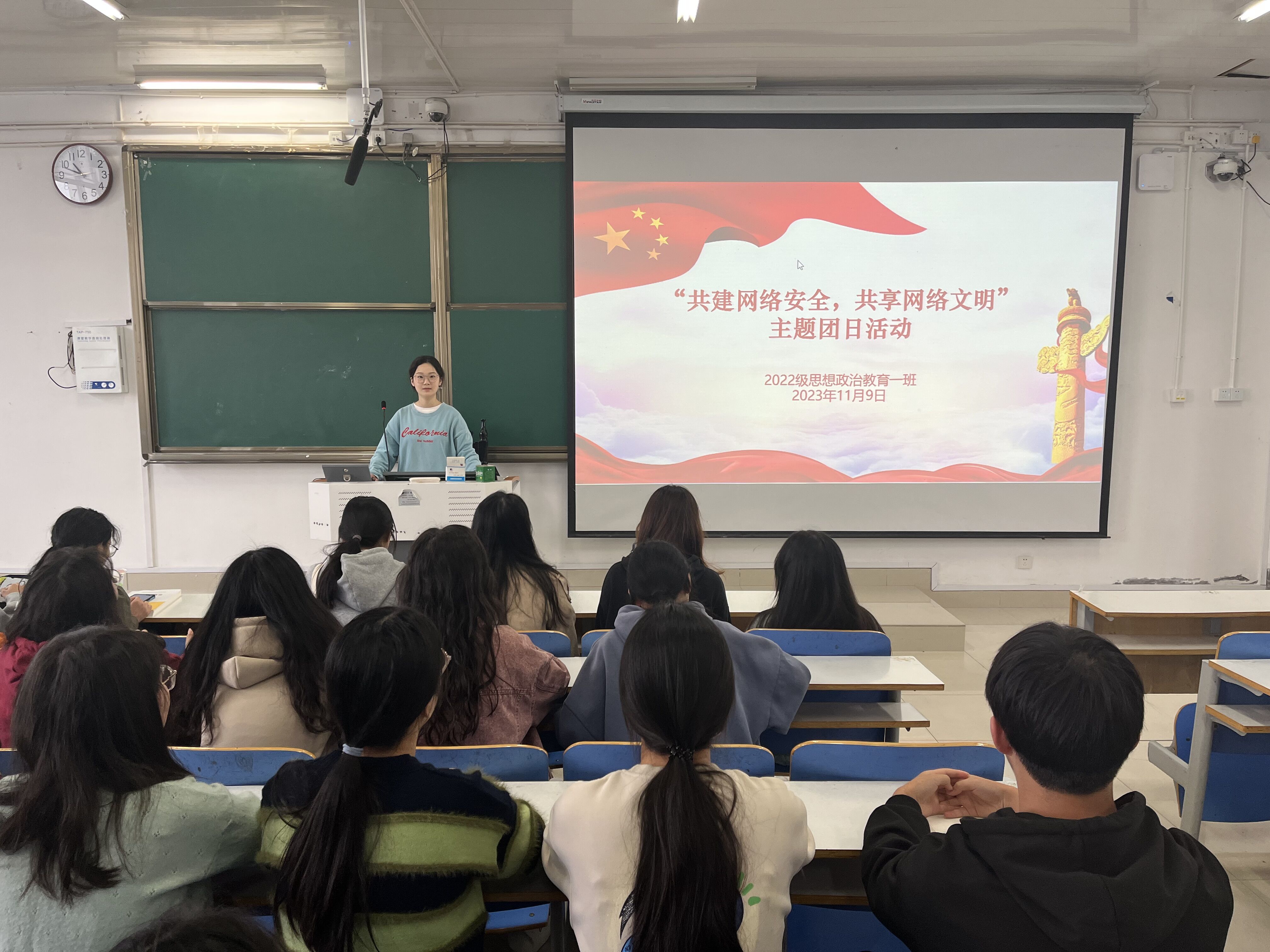 为做好网络安全宣传工作,提升同学们的网络安全意识,11月9日上午,金年会jinnianhuicom2022级思想政治教育一班在社科楼514教室开展“共建网络安全,共享网络文明”主题团日活动。金年会官网2022级思想政治教育一班全体同学共同参与本次活动,活动由团支书李佳茹主持。
