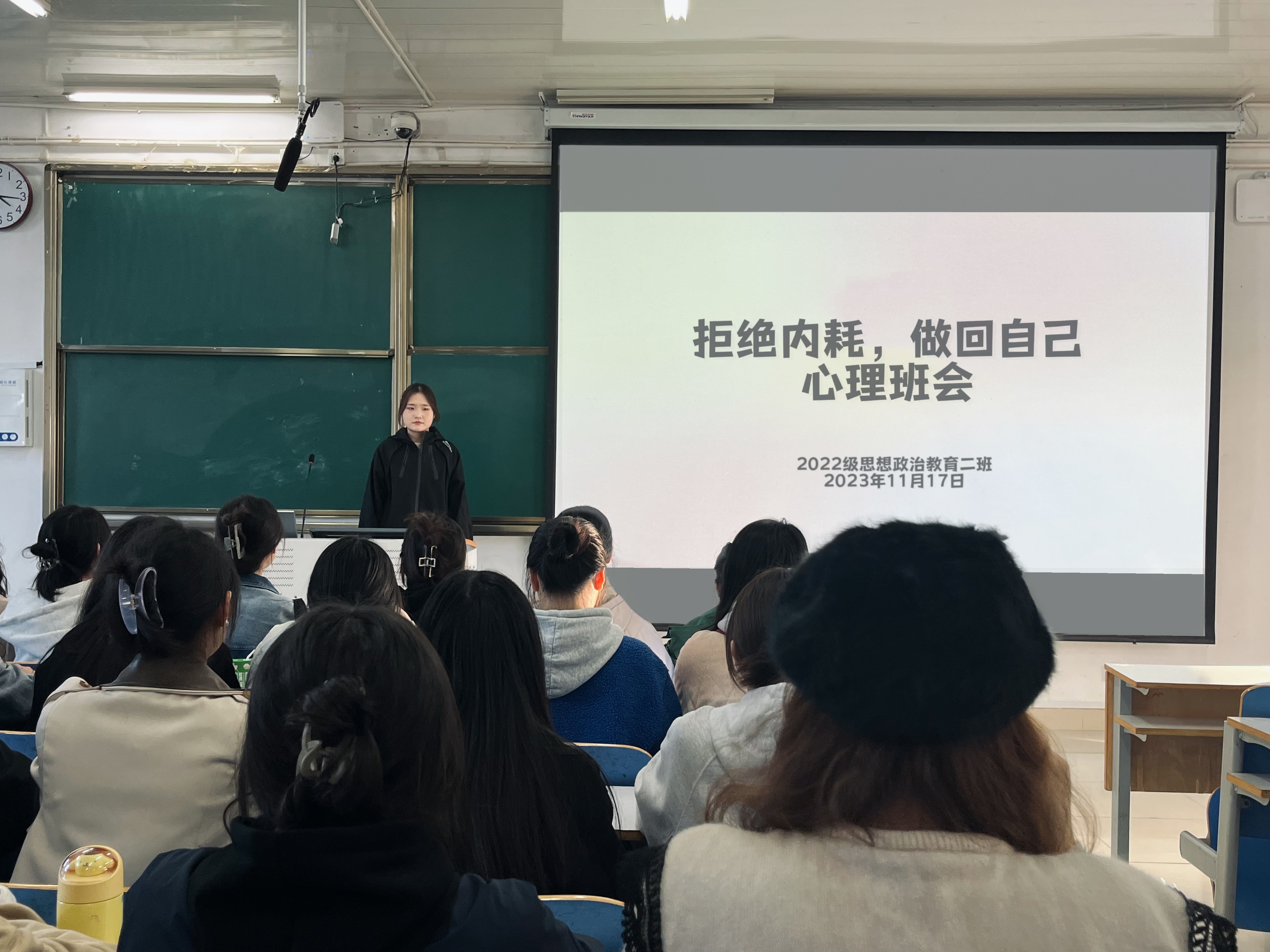 11月17日下午,金年会jinnianhuicom2022级思想政治教育二班在社科楼514教室开展“拒绝内耗,做回自己”心理班会。金年会官网2022级思想政治教育二班全体成员共同参与此次心理班会。班会由心理委员张嘉芮主持。