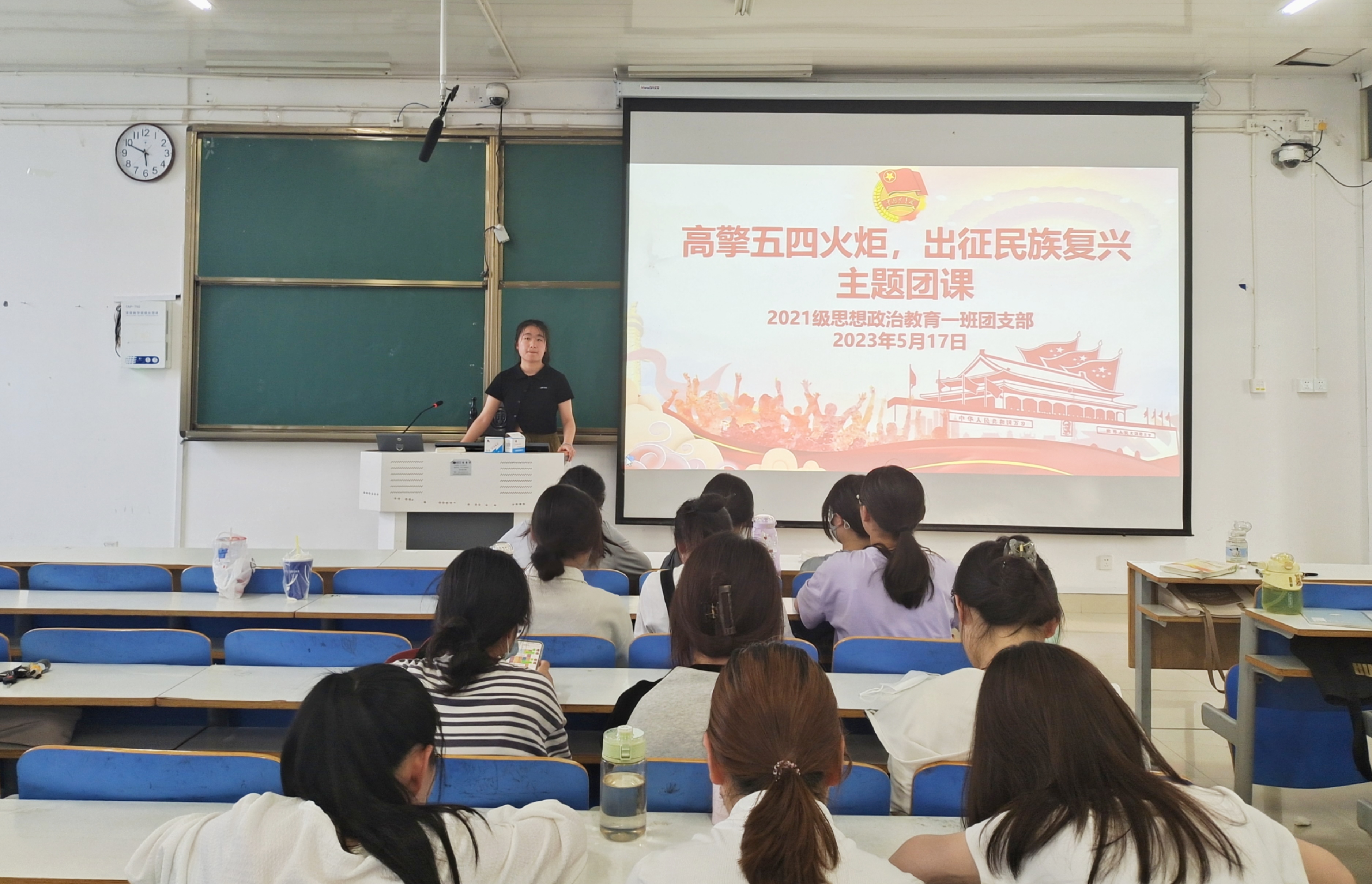 5月17日下午,金年会jinnianhuicom2021级思想政治教育一班在社科楼514教室召开“高擎五四火炬,出征民族复兴”主题团课。2021级思想政治教育一班全体团员共同参加了本次团课。团课由副班长雷敏主持。