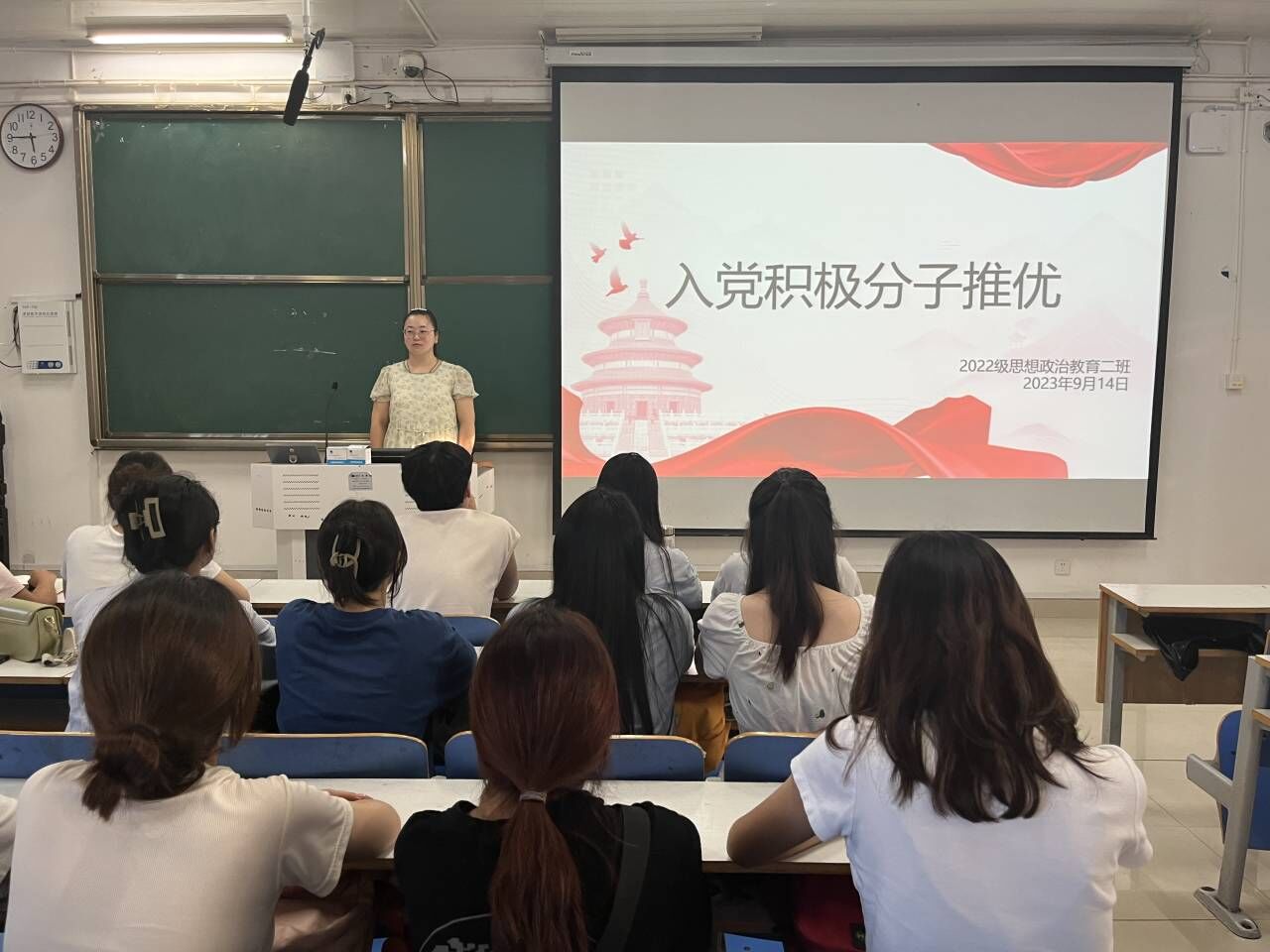 9月14日下午,金年会jinnianhuicom2022级思想政治教育二班在社科楼514教室召开入党积极分子推优大会。金年会官网2022级思想政治教育二班杨春艳老师和全体同学参与本次班会。班会由团支书李佳音主持。