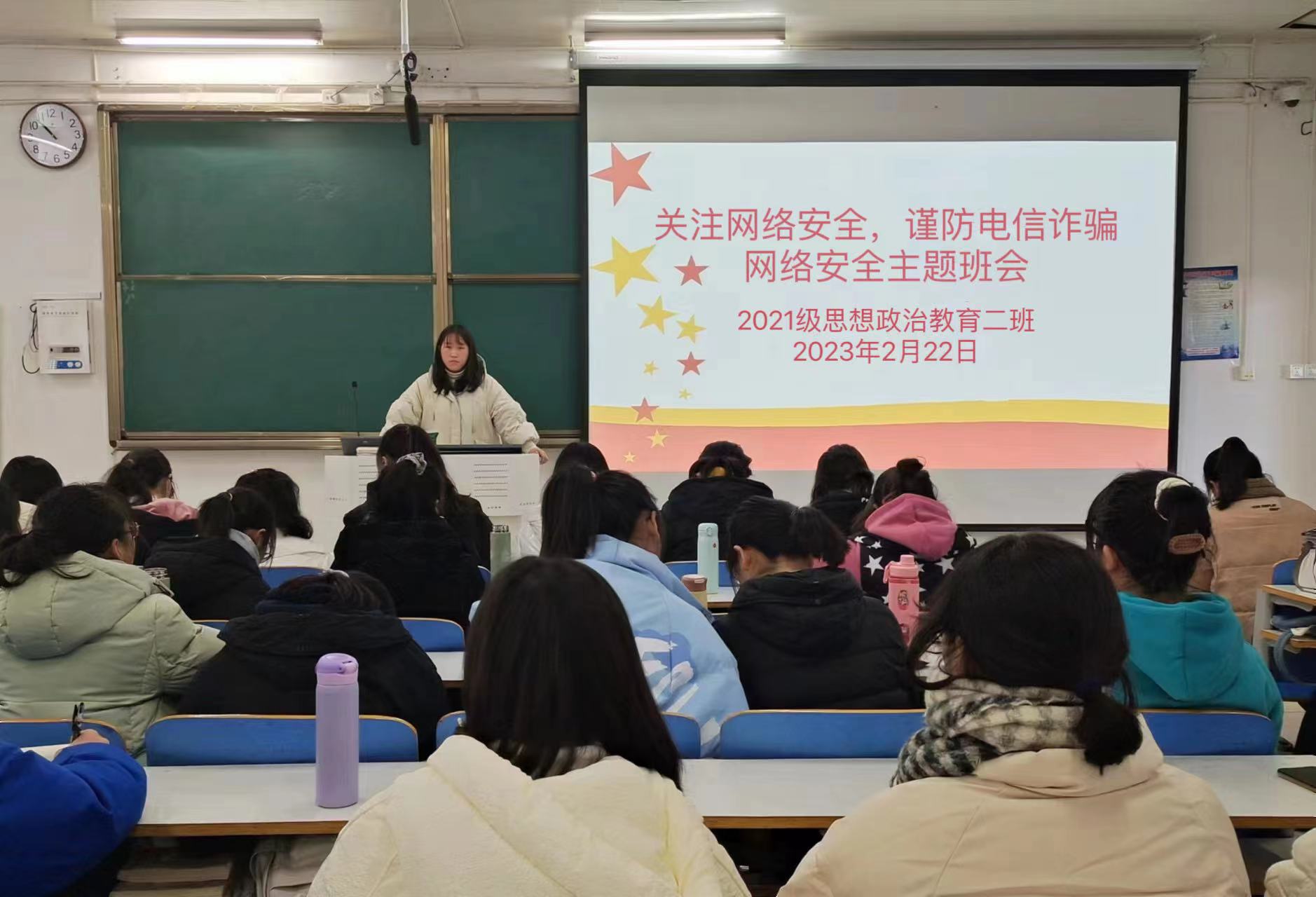 2月22日下午,金年会jinnianhuicom2021级思想政治教育二班在社科楼514教室召开“关注网络安全,谨防电信诈骗”主题班会。2021级思想政治教育二班全体同学参加此次班会。班会由团支书王婧欣主持。