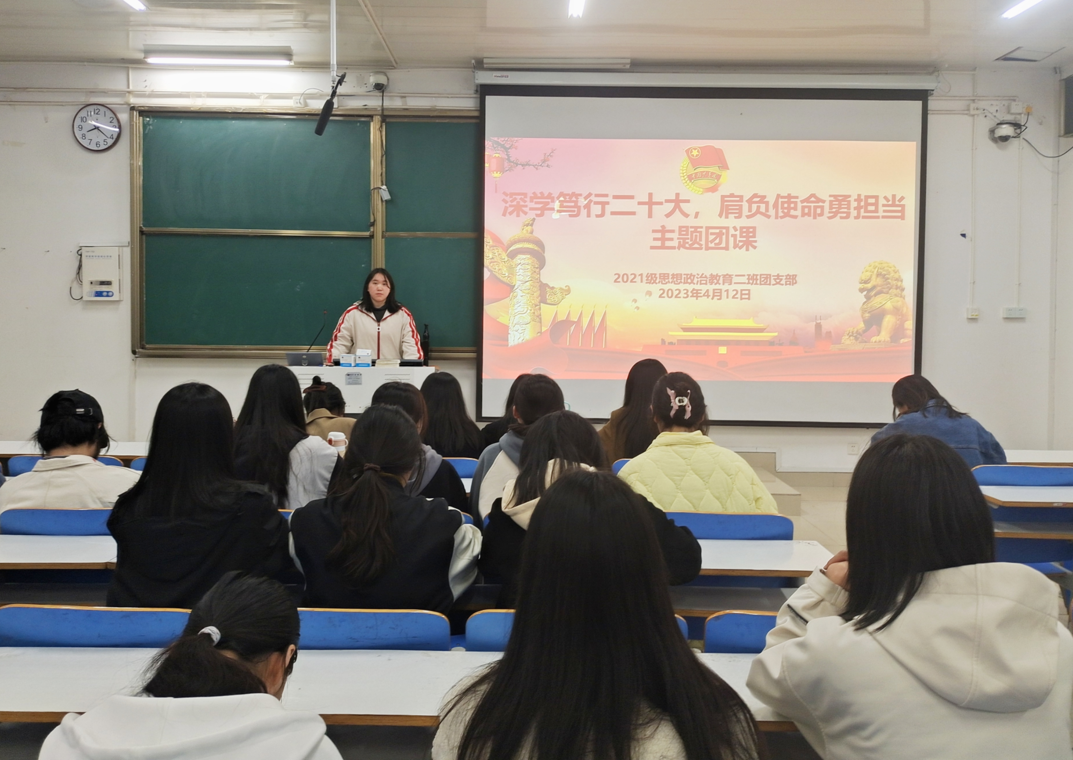 4月12日下午,金年会jinnianhuicom2021级思想政治教育二班在社科楼514教室召开“深学笃行二十大,肩负使命勇担当”主题团课。2021级思想政治教育二班全体团员参加此次团课。团课由团支书王婧欣主持。
