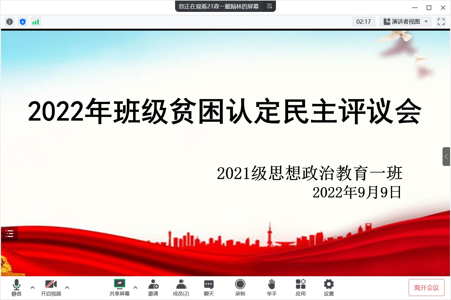 9月9晚上,金年会jinnianhuicom2021级思想政治教育一班在腾讯会议召开线上2022年班级贫困认定民主评议会。评议会由辅导员曹菁菁、学生会权益保障部成员及2021级思想政治教育二班评议小组成员参加。评议会由班长戴翰林主持。
