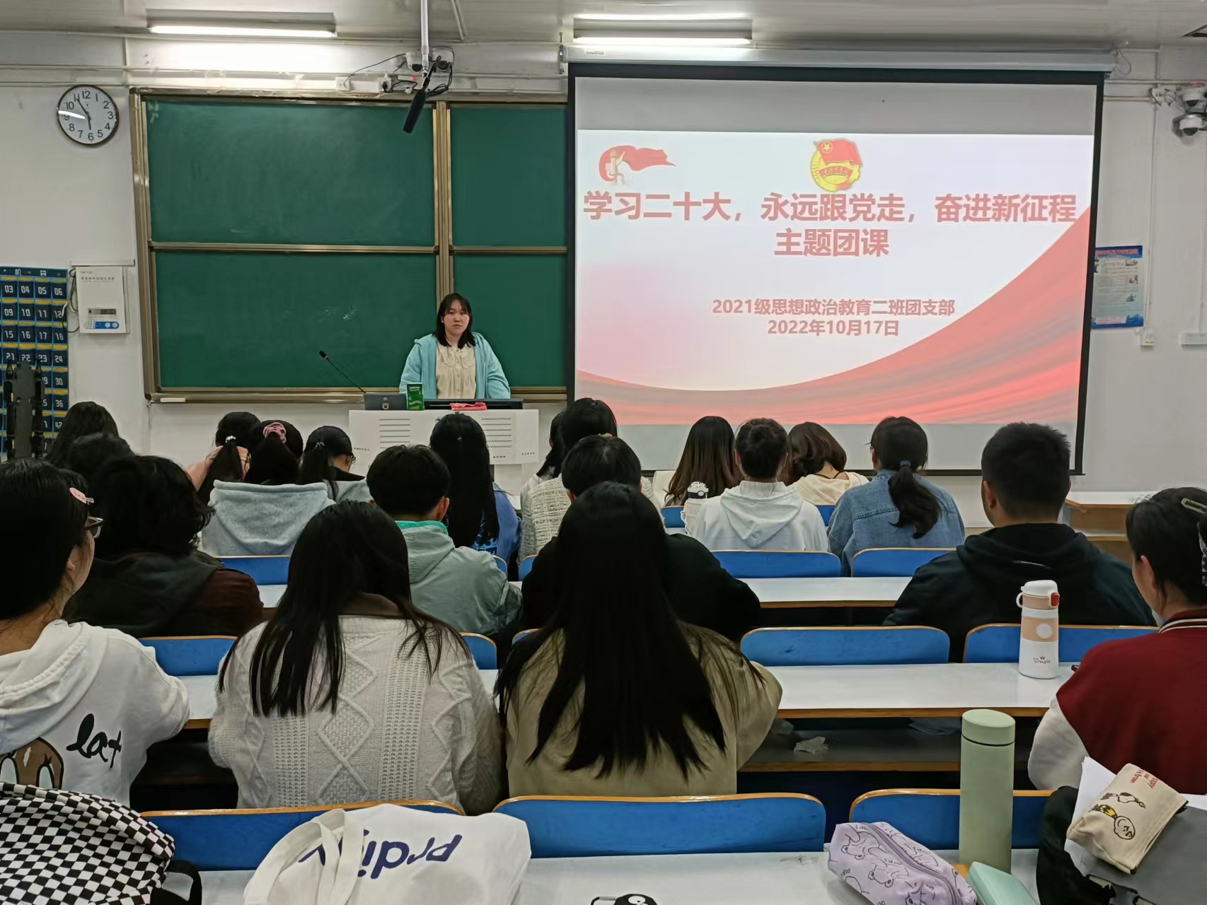 10月17日下午,金年会jinnianhuicom2021级思想政治教育二班在社科楼514教室召开“学习二十大,永远跟党走,奋进新征程”主题团课。2021级思想政治教育二班全体团员参加此次团课。团课由团支书王婧欣主持。