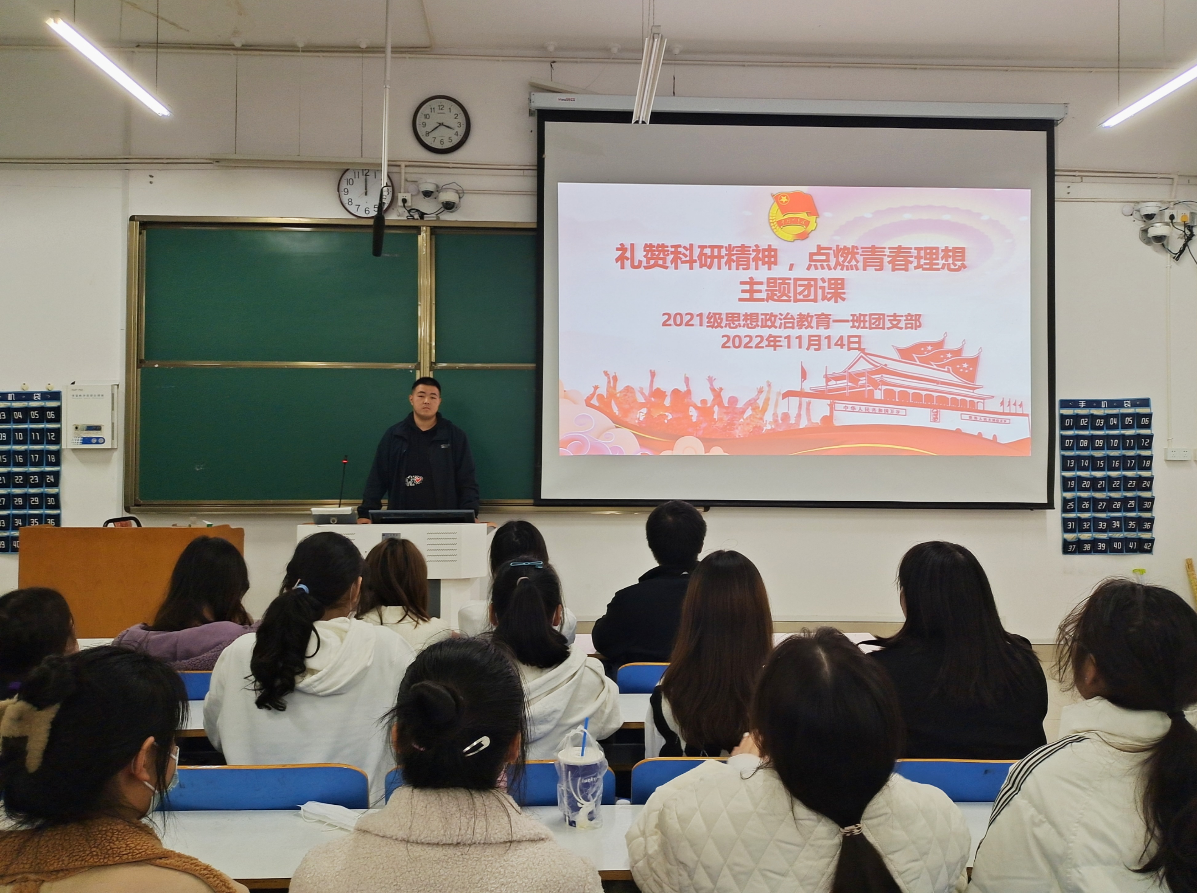 11月14日下午,金年会jinnianhuicom2021级思想政治教育一班在社科楼416教室召开“礼赞科研精神,点燃青春理想”主题团课。2021级思想政治教育一班全体团员共同参与本次团课。团课由团支书戴翰林主持。
