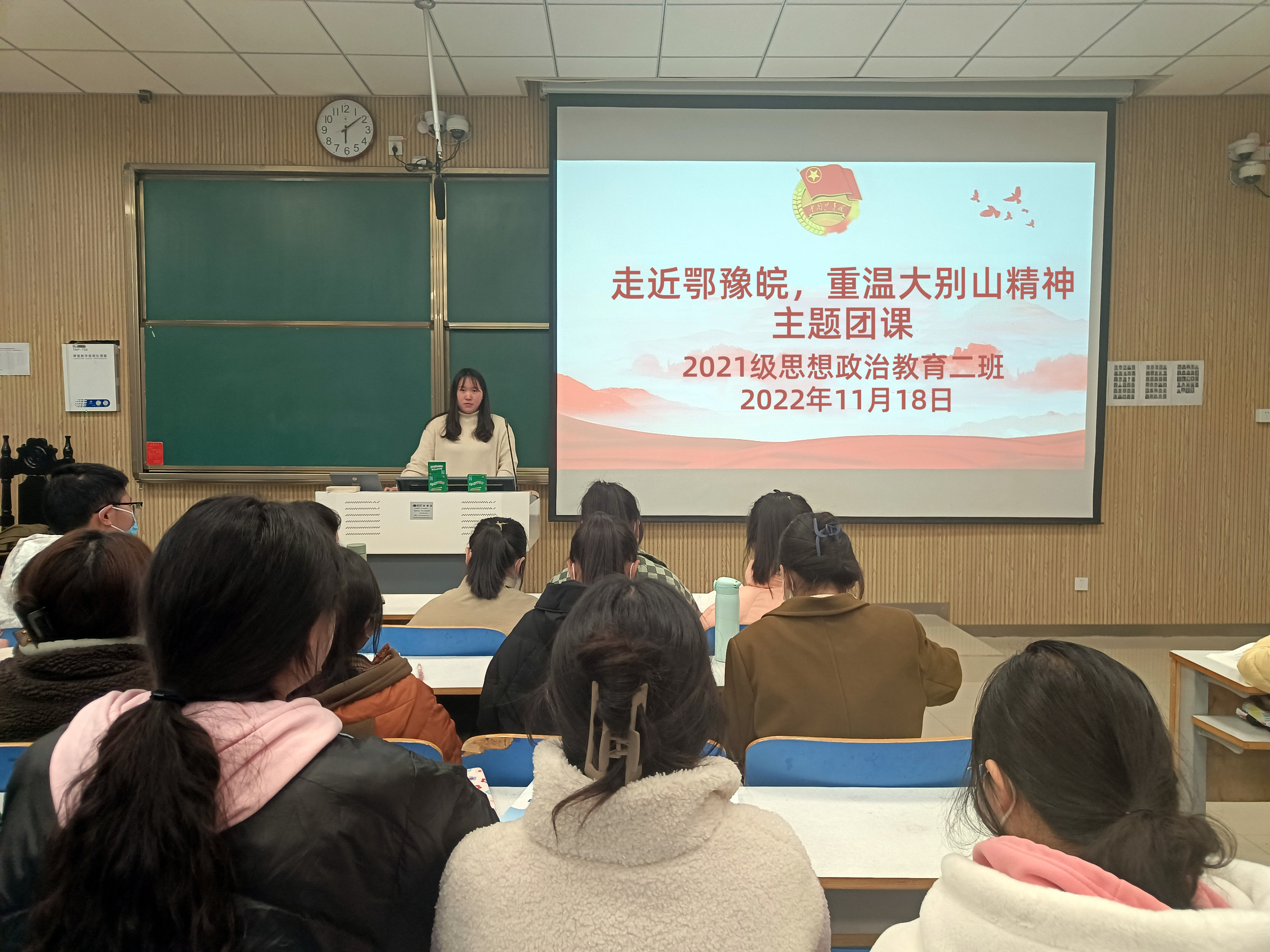 11月18日下午,金年会jinnianhuicom2021级思想政治教育二班在社科楼514教室召开“走近鄂豫皖,重温大别山精神”主题团课。2021级思想政治教育二班全体团员共同参加此次团课。团课由团支书王婧欣主持。
