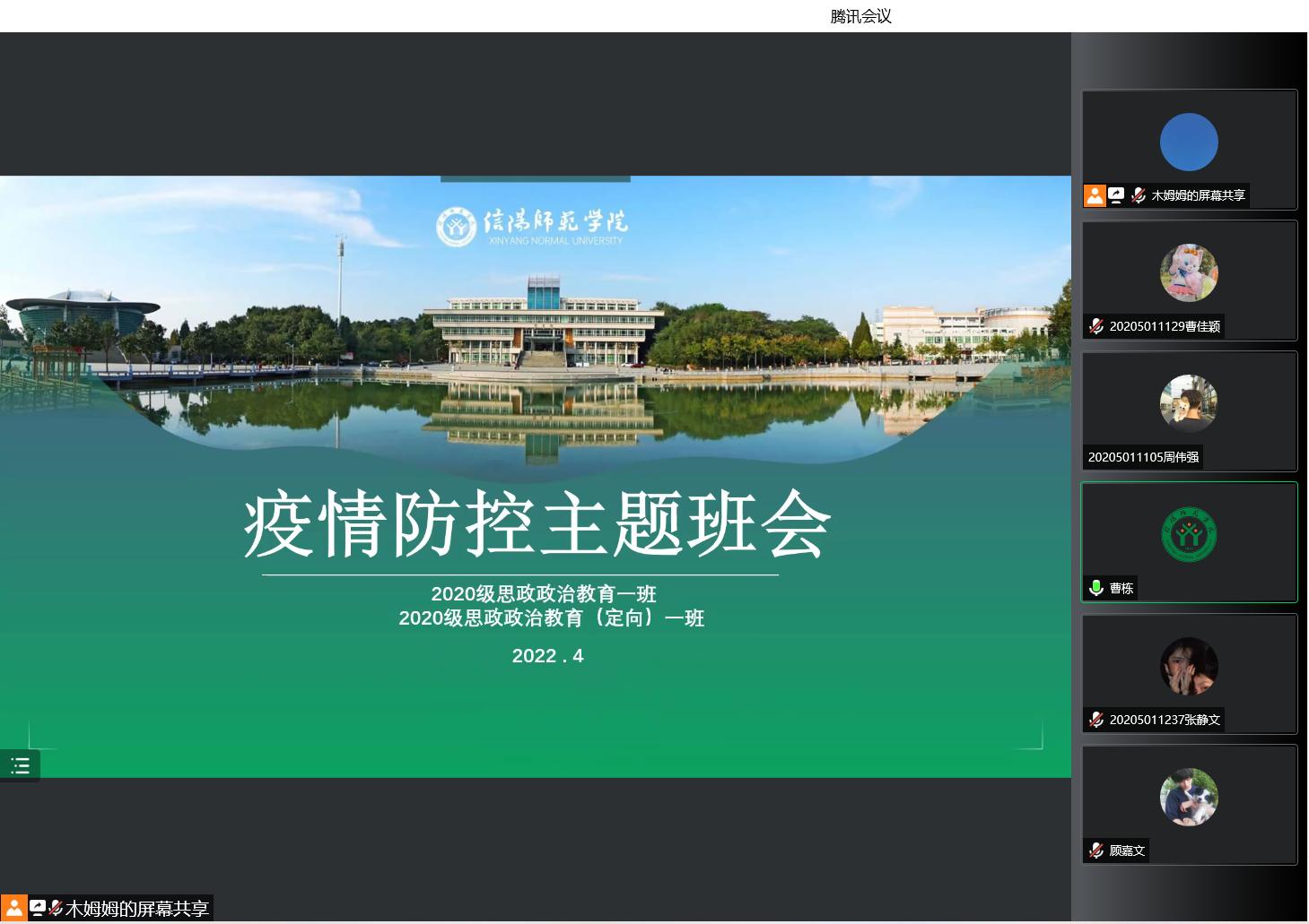 4月3日晚上,金年会jinnianhuicom2020级思想政治教育一班、定向一班在腾讯会议上顺利召开疫情防控主题班会。2020级思想政治教育一班、定向一班全体同学参加此次会议,会议由辅导员曹栋主持。