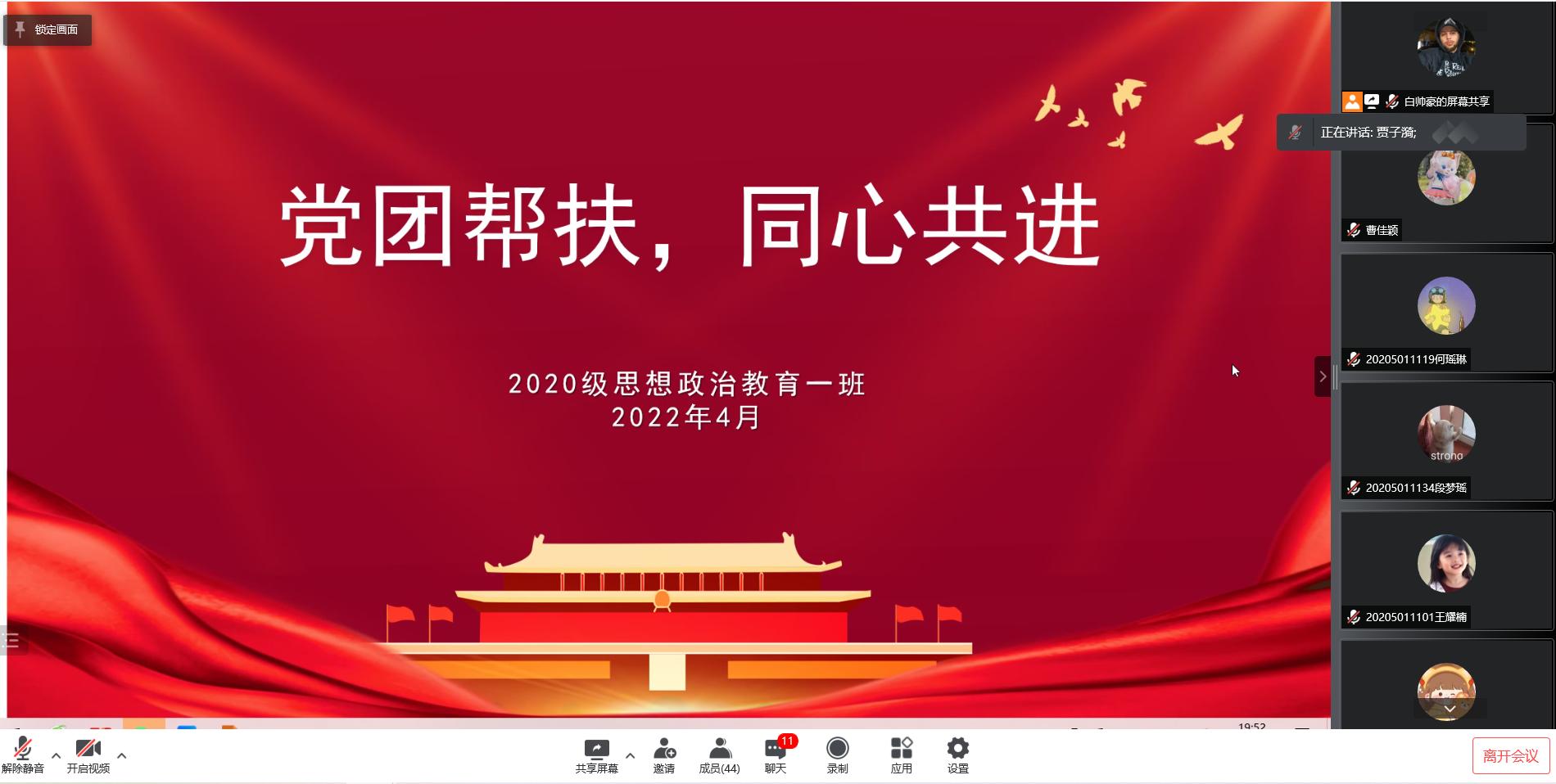 4月25日晚,金年会jinnianhuicom2020级思想政治教育一班在腾讯会议上顺利开展“党团帮扶,同心共进”活动。金年会官网预备党员贾子漪与2020级思想政治教育一班全体同学参加了本次活动,活动由团支部副书记白帅豪主持。