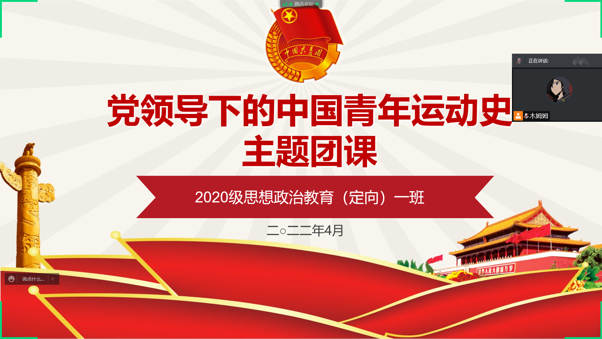 4月26日上午,金年会jinnianhuicom2020级思想政治教育定向一班通过腾讯会议的形式召开了党领导下的中国青年运动史主题团课。2020级思想政治教育定向一班全体同学共同参加本次会议。