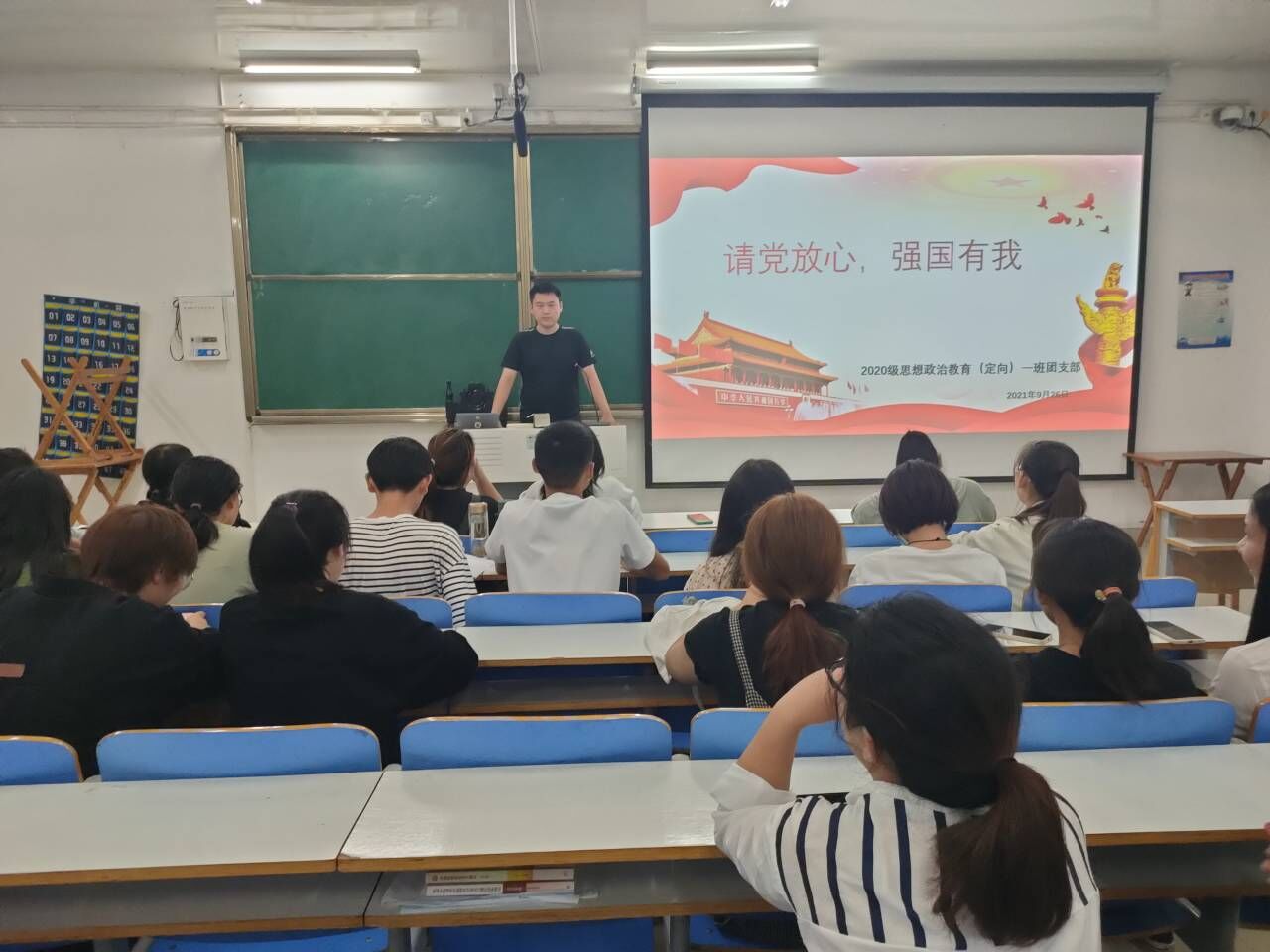 9月26日,金年会jinnianhuicom2020级思想政治教育(定向)一班在社科楼514教室顺利举办“请党放心 强国有我”主题班会。思想政治教育(定向)一班全体学生聆听了此次会议。