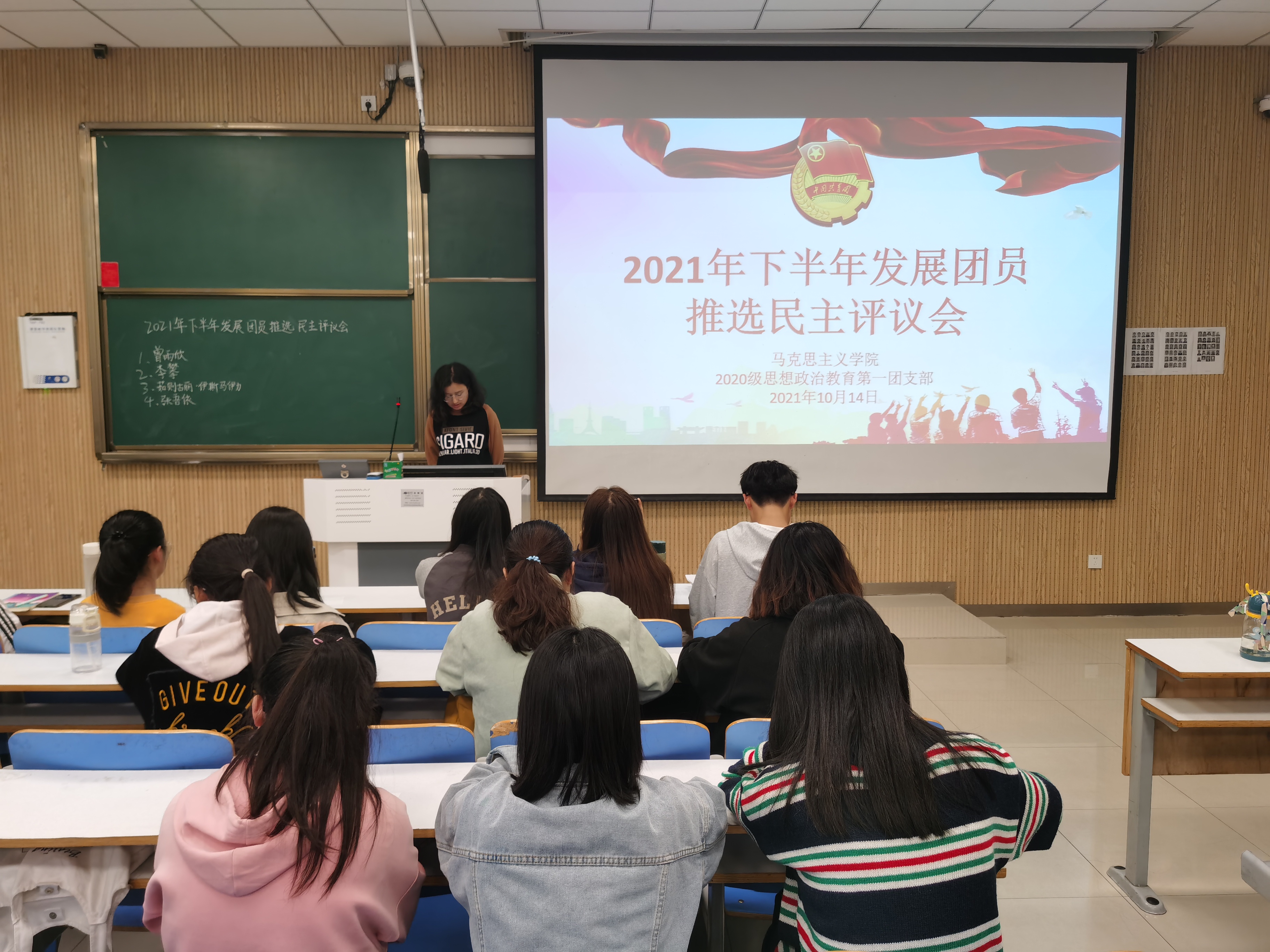 本次民主评议会坚持“公平、公正、公开”的原则,评议团由团支部全体团员组成。会议伊始,白帅豪介绍四位推选人员,宣读青年团员发展的条件并说明了评选的规则,本次评选采用无记名投票方式进行,每人一票。接着,选举人依次上台发言。每位选举人准备充分,信心满满,主要讲述了各自入学一年来的优秀事例以及对团的认识和入团后的打算,展现出入团的强烈愿望和决心。随后,我班同学积极参与投票,严格遵守一人一票的投票制度。推选大会在同学们的全程参与和监督下顺利结束。