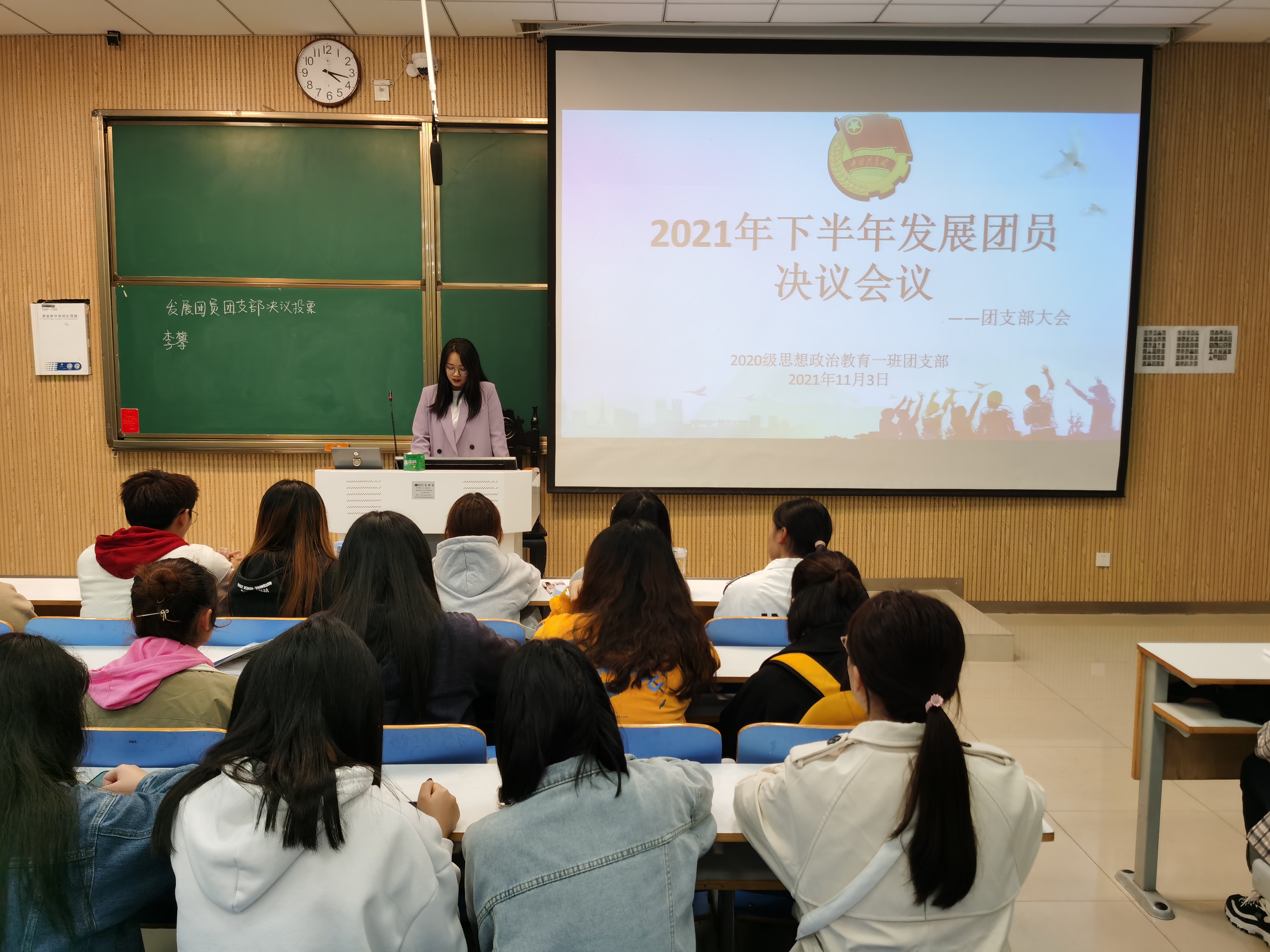 11月4日下午,金年会jinnianhuicom 2020 级思想政治教育一班在社科楼515教室召开“2021年下半年发展团员决议”团支部大会。2020 级思想政治教育一班全体团员参加了本次大会,大会由团支书卢茜雨主持。