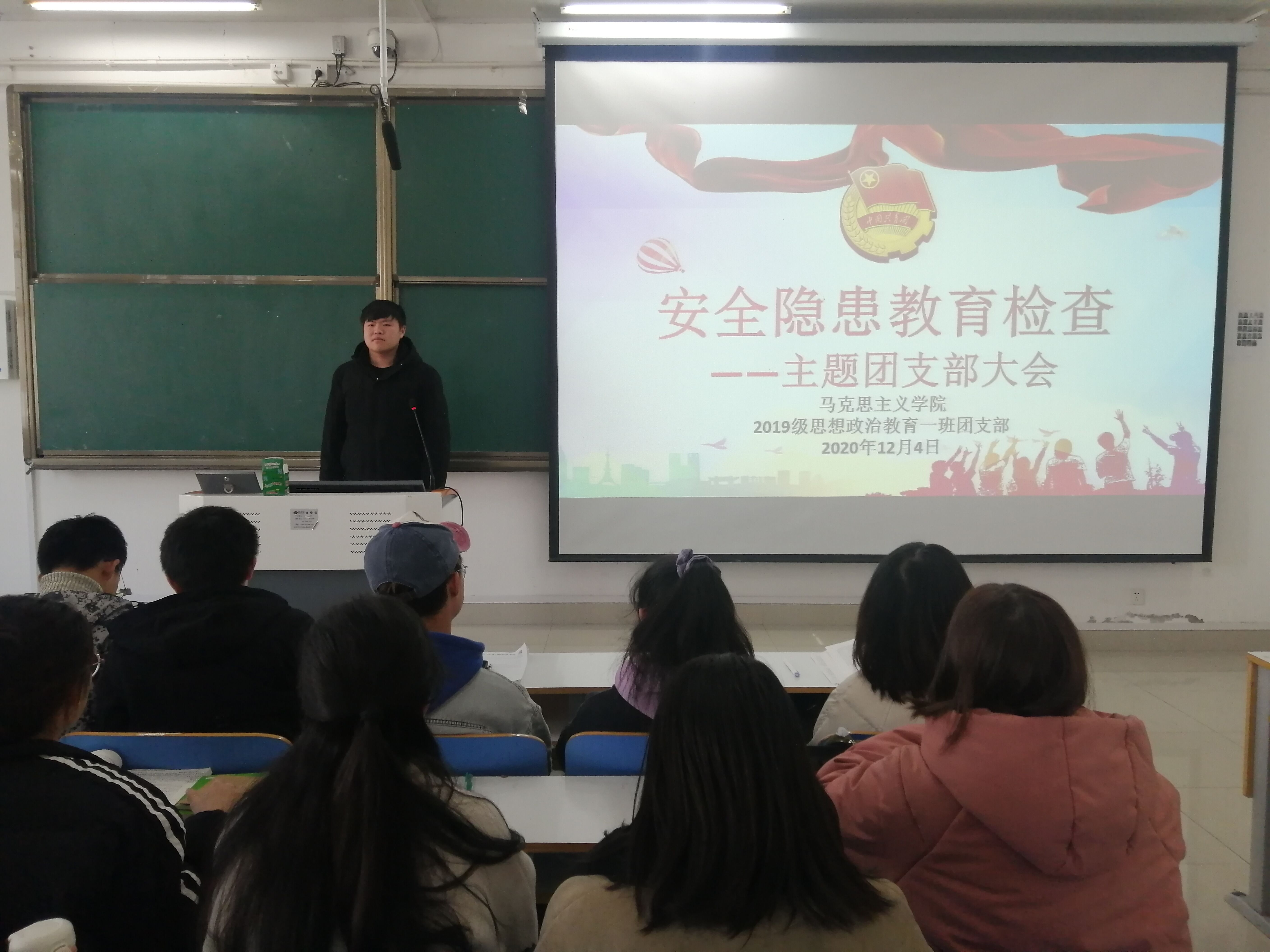 为进一步加强同学们的安全教育观念,提高同学们的避险能力。12月4日上午,金年会jinnianhuicom2019级思想政治教育一班第一团支部在社科楼516教室召开“安全隐患教育”主题团支部大会。金年会jinnianhuicom2019级思想政治教育一班全体成员参加本次会议,会议由副班长王民主持。