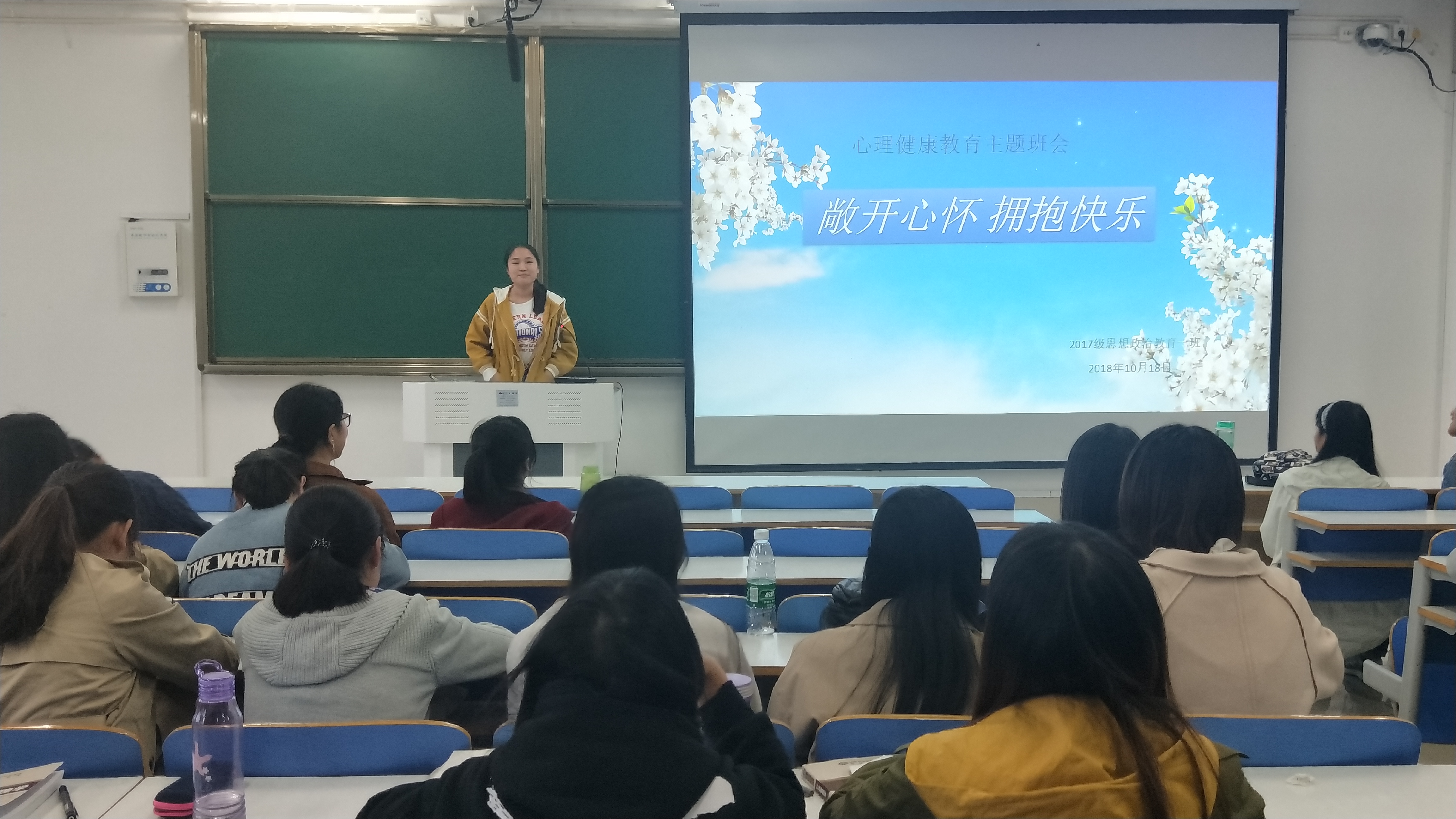为提高我班学生心理调节能力,保持积极向上的心态,10月22日下午,金年会jinnianhuicom2017级思想政治教育一班全体学生在社科楼514教室举办了“敞开心扉,拥抱快乐”主题班会,本次班会由团支书谢文静主持。