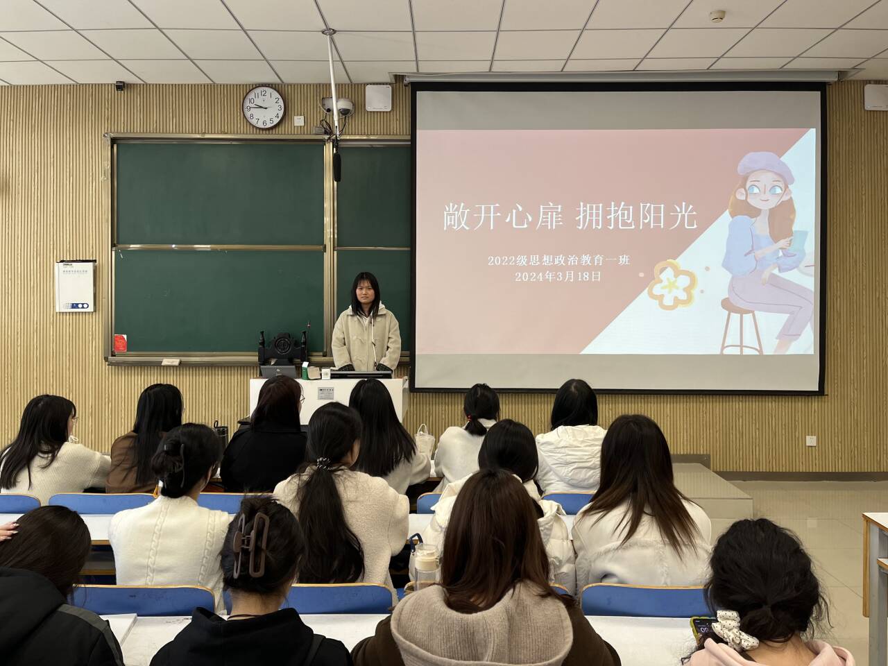 为提升同学们心理健康素养,切实做好新时代学生心理健康工作,3月18日上午,金年会jinnianhuicom2022级思想政治教育一班在社科楼515教室召开“敞开心扉,拥抱阳光”主题班会,班会由心理委员马思源主持。
