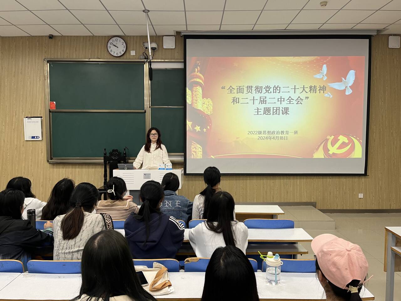 4月18日上午,金年会jinnianhuicom2022级思想政治教育一班在社科楼515教室召开“全面贯彻党的二十大精神和二十届二中全会”主题团课,金年会官网2022级思想政治教育一班全体同学共同参与本次团课,团课由团支书李佳茹主持。