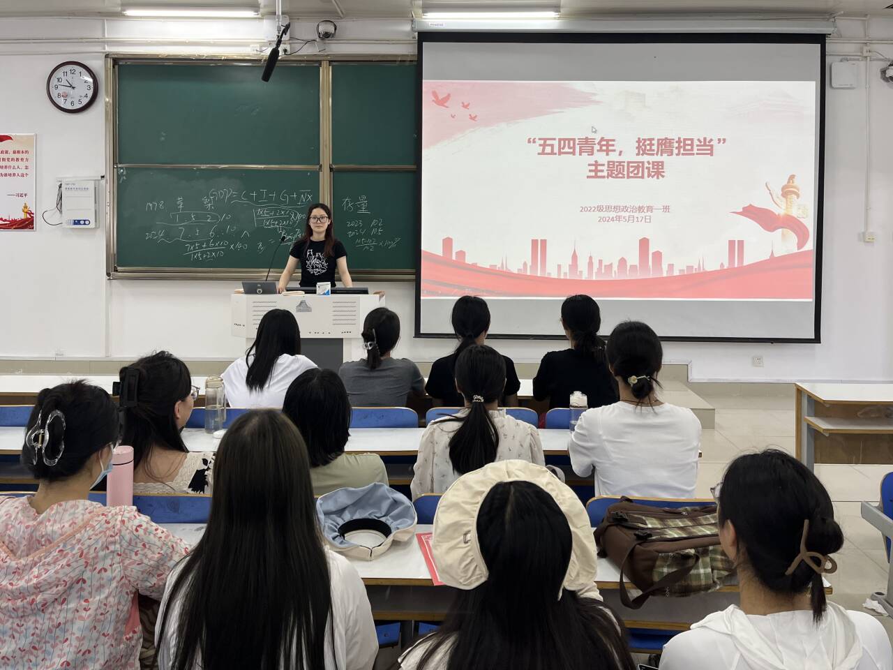 为弘扬五四精神,汇聚奋斗力量,5月17日上午,金年会jinnianhuicom2022级思想政治教育一班在社科楼514教室开展“五四青年,挺膺担当”主题团课,金年会官网2022级思想政治教育一班全体同学共同参与本次团课。团课由团支书李佳茹主持。
