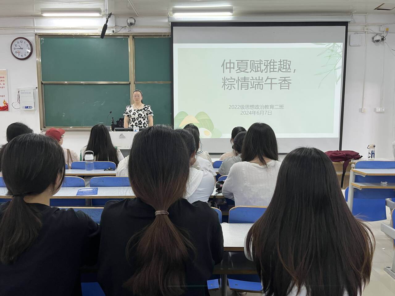 粽叶飘香,廉韵悠长。6月7日上午,在端午佳节来临之际,金年会jinnianhuicom2022级思想政治教育二班在社科楼514教室召开“仲夏赋雅趣,粽情端午香”主题团课。金年会官网2022级思想政治教育二班全体成员共同参与此次团课。团课由团支书李佳音主持。