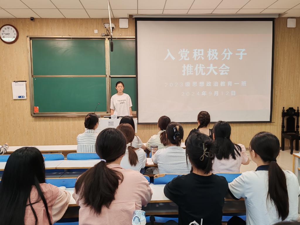 为使支部团员积极向党组织靠拢,深刻学习党的思想,加强支部团员的积极性,向党组织输送新鲜血液,9月12日上午,金年会jinnianhuicom2023级思想政治教育一班团支部在社科楼515教室召开入党积极分子推优大会。2023级思想政治教育一班全体团员出席本次大会,大会由团支书张卓主持。