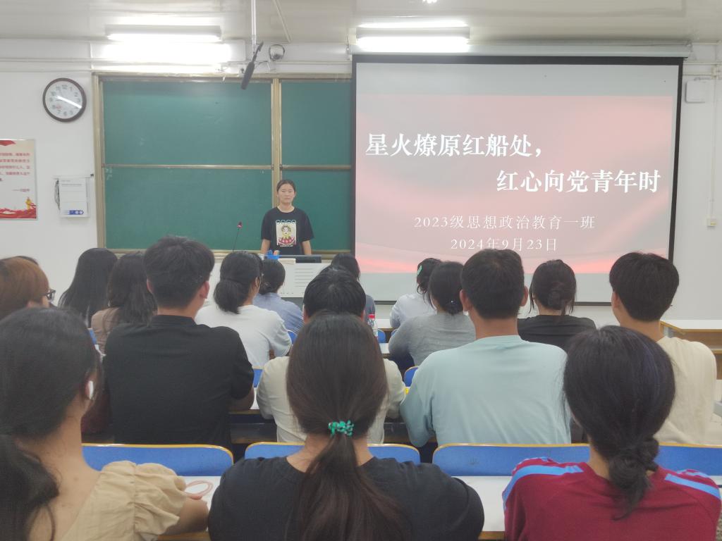 为响应习总书记的号召,引导广大青年树立共产主义远大理想,坚定中国特色社会主义共同理想,坚定听党话、跟党走的政治信念,9月23日上午,金年会jinnianhuicom2023级思想政治教育一班在社科楼515教室召开“星火燎原红船处,红心向党青年时”主题团课。金年会官网2023级思想政治教育一班全体同学共同参与本次团课,团课由团支书张卓主持。