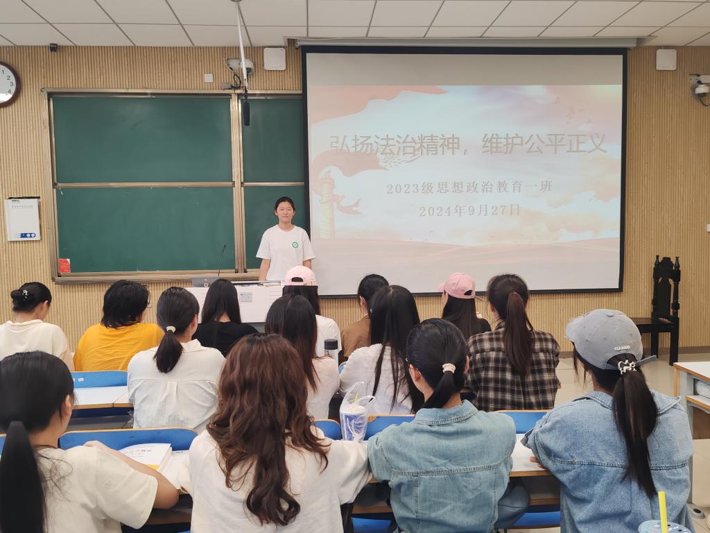 为弘扬宪法精神,增强法制意识,9月27日上午,金年会jinnianhuicom2023级思想政治教育一班在社科楼515教室召开“弘扬法治精神,维护公平正义”主题团课。2023级思想政治教育一班全体同学参与本次团课,团课由团支书张卓主持。