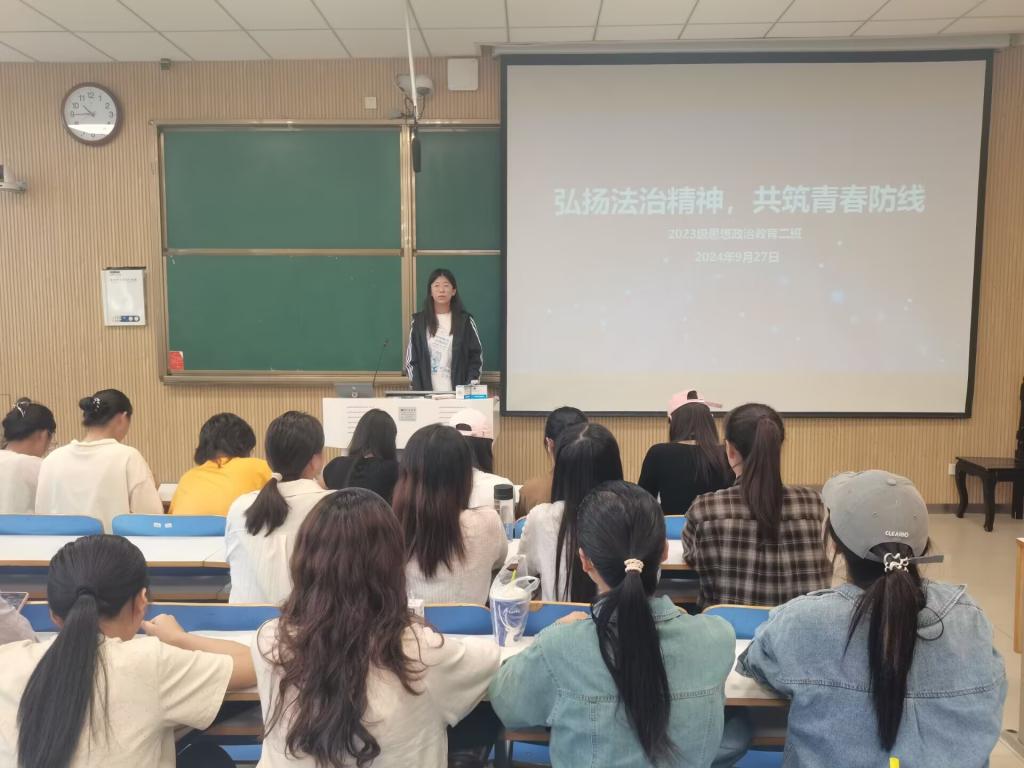 为弘扬社会主义法治精神,提高学生法治意识,9月27日上午,金年会jinnianhuicom2023级思想政治教育二班在社科楼515教室开展“弘扬法治精神,共筑青春防线”主题班会。本次班会由班长王慜初主持,全体二班同学参加。