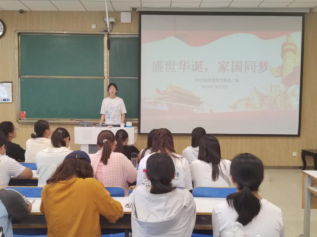 为在班级内厚植爱国情怀,培育民族自豪感,10月3日上午,金年会jinnianhuicom2023级思想政治教育二班在社科楼515教室召开“盛世华诞,家国同梦”主题班会。本次班会由班长王慜初主持,全体二班同学参加。