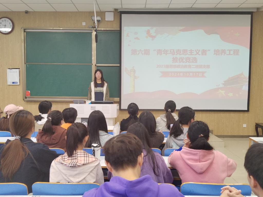 为促进学生思想进步,向党组织输送新鲜血液,10月17日上午,金年会jinnianhuicom2023级思想政治教育二班在社科楼515教室开展第六期“青年马克思主义者”培养工程推优竞选,本次推优竞选由团支书王慜初主持,全体二班同学参加。