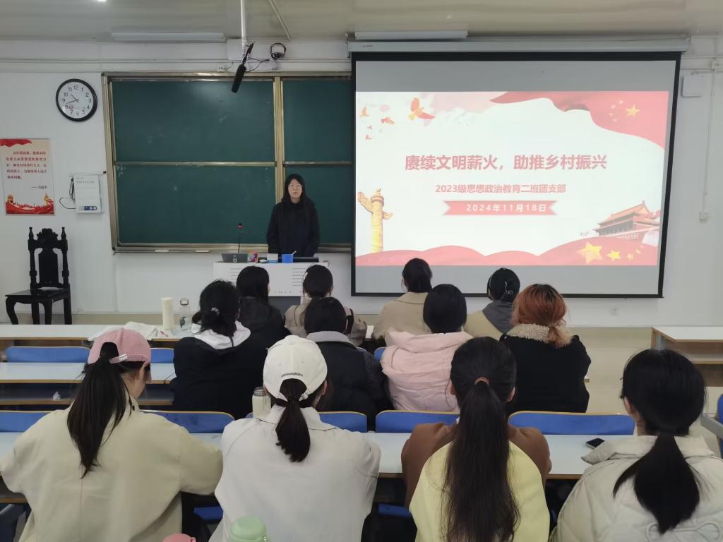 为推动青年大学生深入学习国家政策,增强历史使命感和责任感,11月18日上午,金年会jinnianhuicom2023级思想政治教育二班在社科楼515教师开展“赓续文明薪火,助推乡村振兴”主题团课。本次团课由团支书王慜初主持,全体二班同学参加。