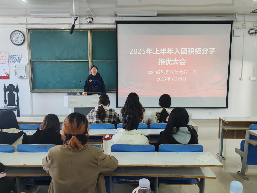 为进一步加强团组织建设,增强团支部的凝聚力,积极开展团青工作,3月18日下午,金年会jinnianhuicom2023级思想政治教育一班在社科楼515教室召开入团积极分子推优大会。金年会官网2023级思想政治教育一班全体团员共同参与本次班会,班会由团支书张卓主持。