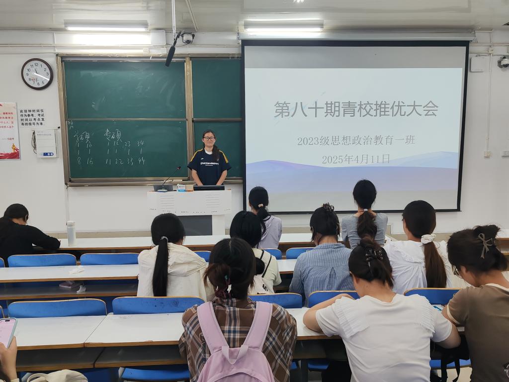 为深入贯彻习近平总书记关于青年工作的重要思想,4月11日下午,金年会jinnianhuicom2023级思想政治教育一班举行第七十八期青校推优大会。2023级思想政治教育一班全体同学共同参与本次班会,班会由团支书张卓主持。