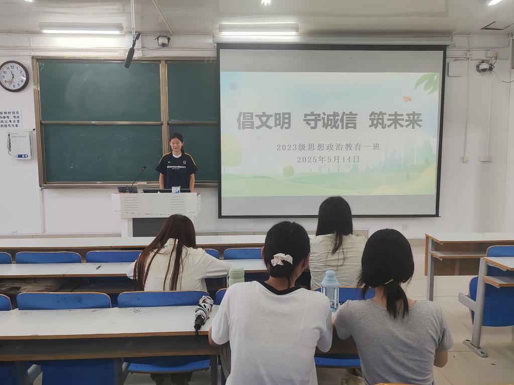 为培育文明风尚,强化诚信意识,引导青年学子规划美好未来,5月14日下午,金年会jinnianhuicom2023级思想政治教育一班在社科楼514教室召开“倡文明,守诚信,筑未来”主题班会。金年会官网2023级思想政治教育一班全体同学共同参与本次班会,班会由班长张卓主持。