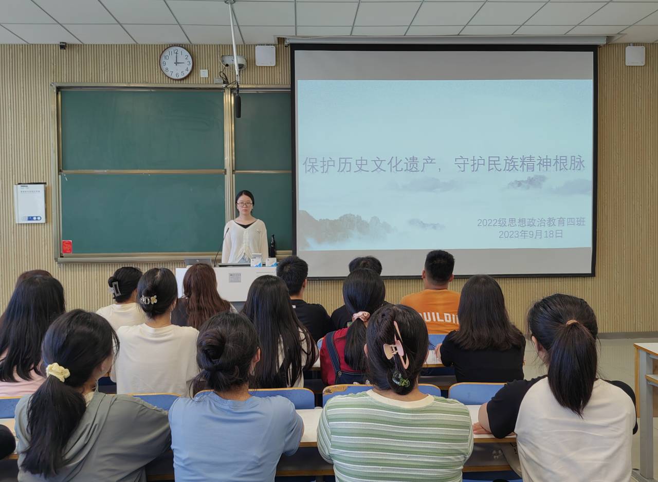 为进一步提高大家对历史文化遗产的保护意识,营造文化遗产保护的良好社会氛围,9月18日下午,金年会jinnianhuicom2022级思想政治教育四班在社科楼515教室召开“保护历史文化遗产,守护民族精神根脉”主题团课。金年会官网2022级思想政治教育四班全体同学参与本次班会。团课由团支书牛志杰主持。