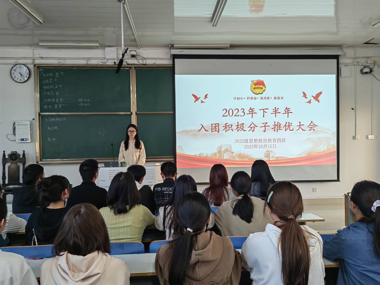 为积极引导和教育广大青年学生继承和弘扬共青团的光荣传统,为团组织注入新鲜血液,10月15日下午,金年会jinnianhuicom2022级思想政治教育四班在社科楼514教室召开入团积极分子推优大会。金年会官网2022级思想政治教育四班全体同学共同参与本次班会。会议由团支书牛志杰主持。