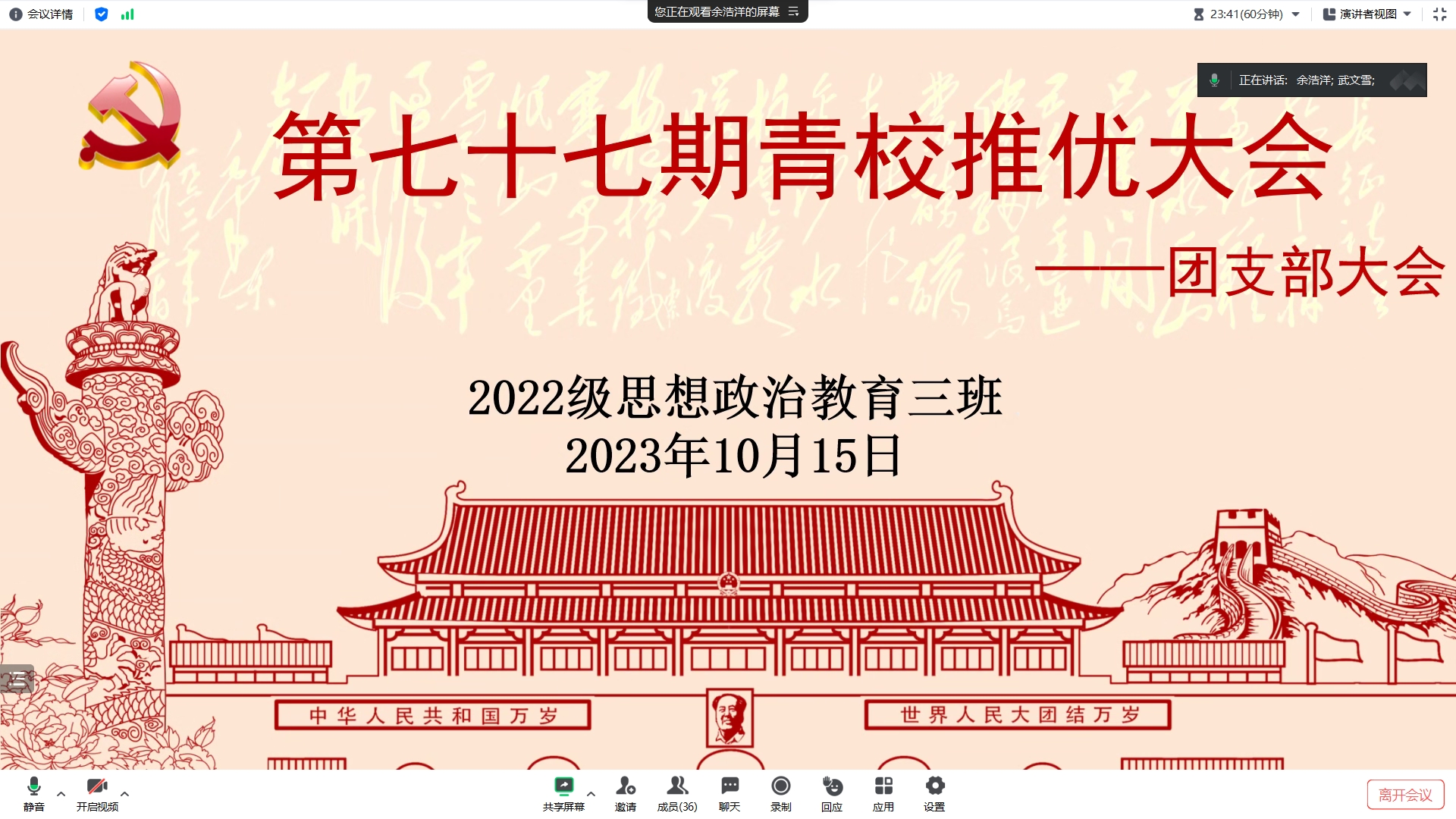 10月15日下午,金年会jinnianhuicom2022级思想政治教育三班在线上召开“青年共产主义学校”推优大会。金年会官网2022级思想政治教育三班全体同学共同参与此次大会。大会由团支书余浩洋主持。