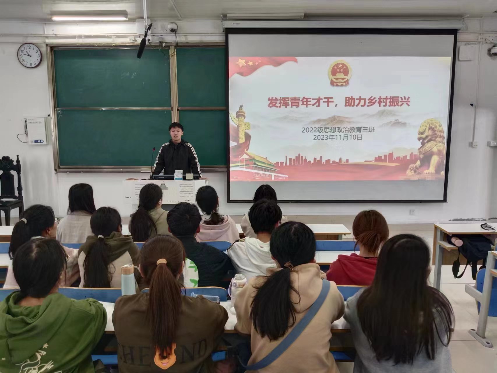 11月10日上午,金年会jinnianhuicom2022级思想政治教育三班在社科楼514教室召开“发挥青年才干,助力乡村振兴”主题团课。金年会官网2022级思想政治教育三班全体成员共同参与本次团课,团课由团支书余浩洋主持。