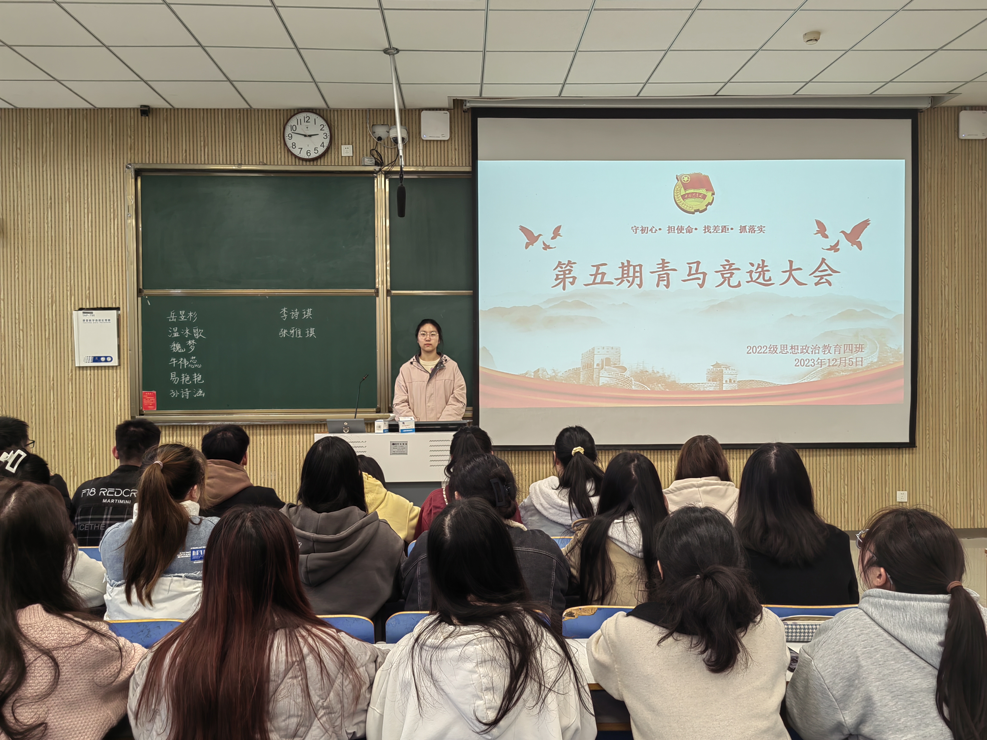 为进一步学习贯彻习近平新时代中国特色社会主义思想,保障青年马克思主义者培养工程接续发展,12月5日下午,金年会jinnianhuicom2022级思想政治教育四班在社科楼515教室召开第五期青马竞选大会。金年会官网2022级思想政治教育四班全体同学参与本次班会。本次团课由团支书牛志杰主持。