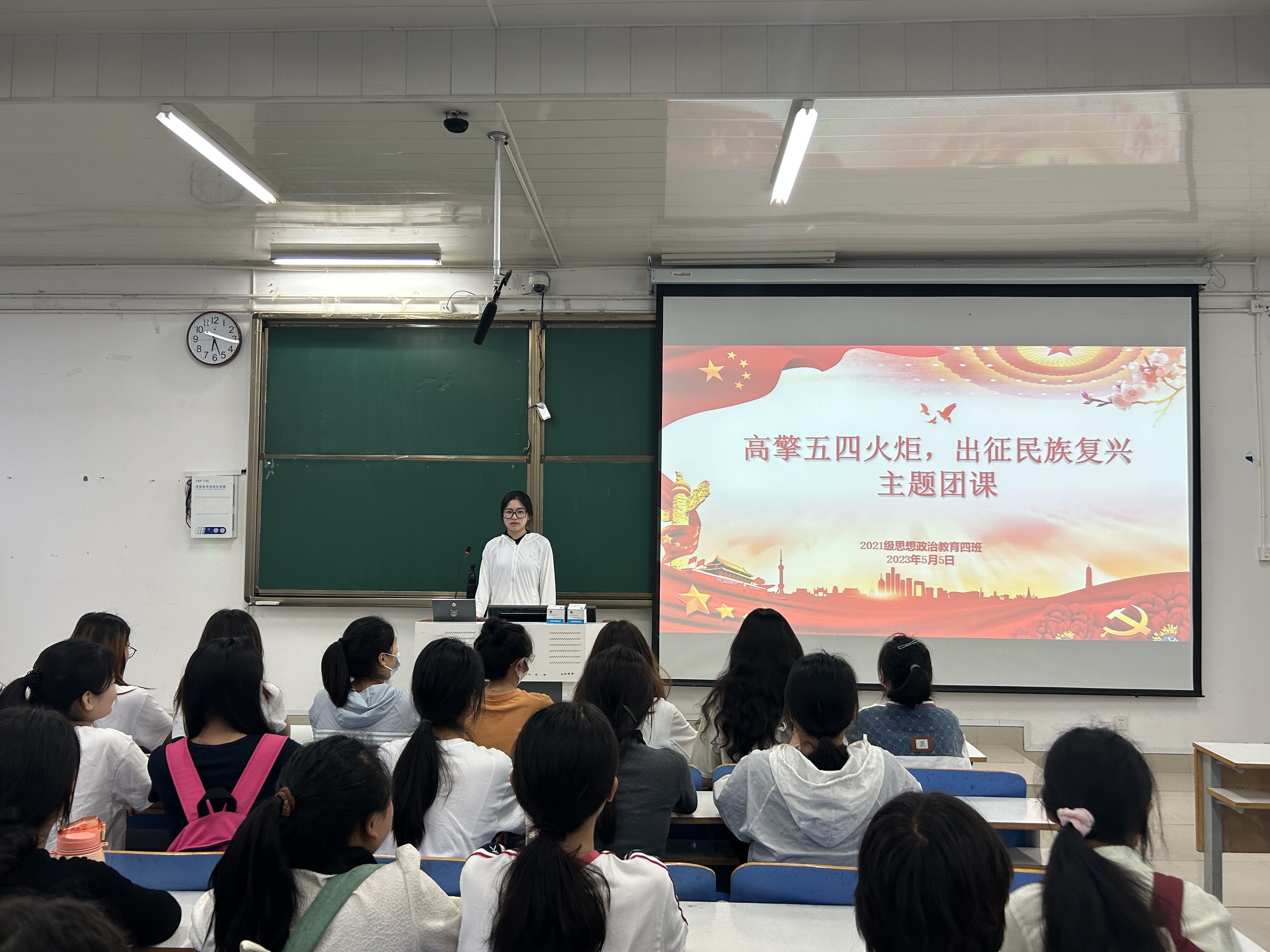 5月5日下午,金年会jinnianhuicom2021级思想政治教育四班在社科楼514教室开展“高擎五四火炬,出征民族复兴”主题团课。2021级思想政治教育四班全体团员参加本次团课。团课由团支书刘珂含主持。
