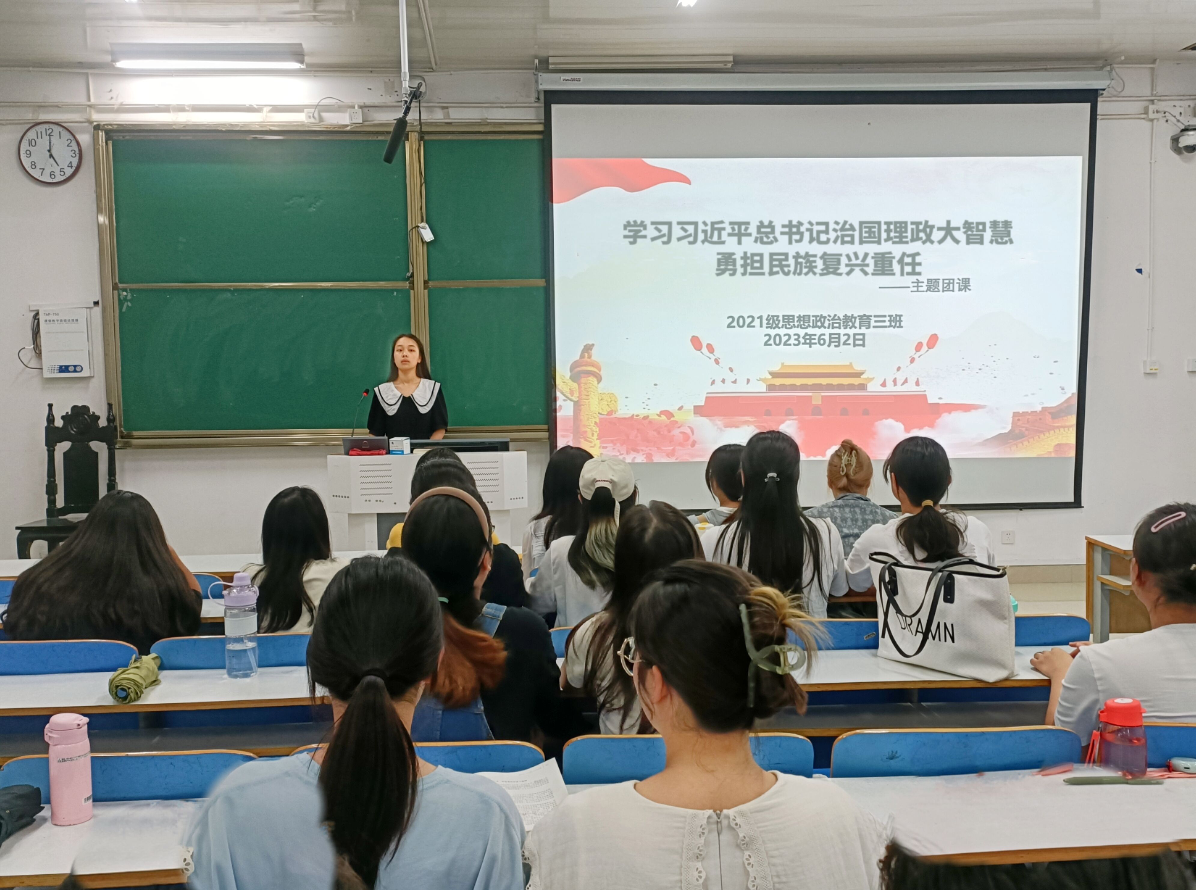 6月2日下午,金年会jinnianhuicom2021级思想政治教育三班在社科楼514教室召开“学习习近平总书记治国理政大智慧,勇担民族复兴重任”主题团课。金年会jinnianhuicom2021级思想政治教育三班全体团员参与此次会议。会议由团支书王岚霄主持。