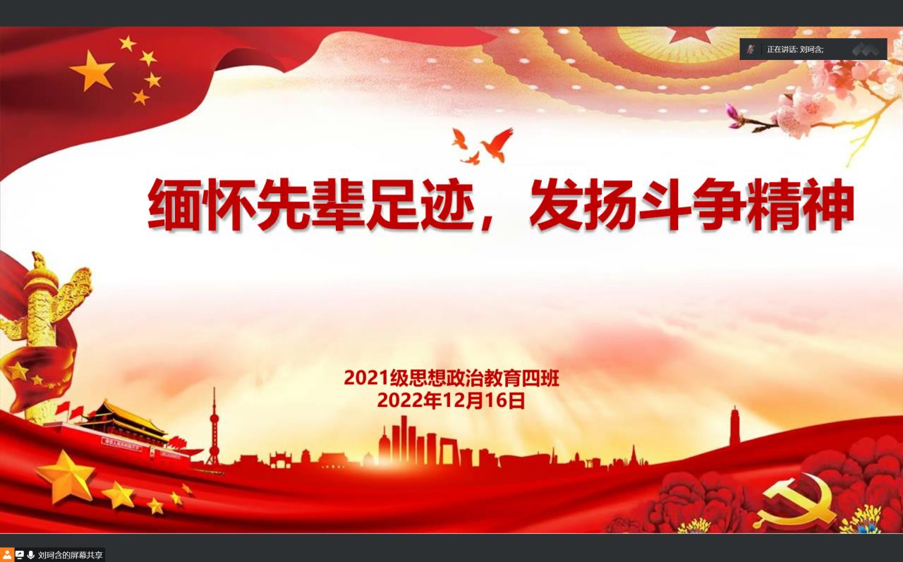 12月16日下午,金年会jinnianhuicom2021级思想政治教育四班线上召开“缅怀先辈足迹,发扬斗争精神”主题团课。思想政治教育四班全体团员参加本次团课。团课由团支书刘珂含主持。